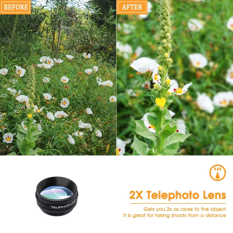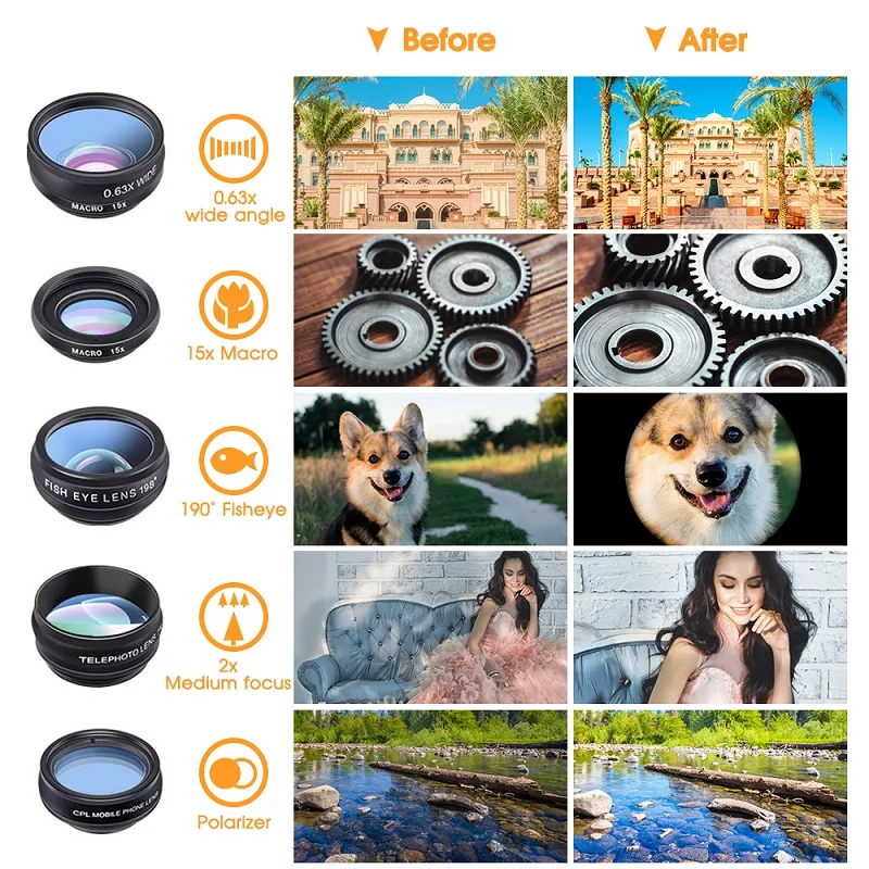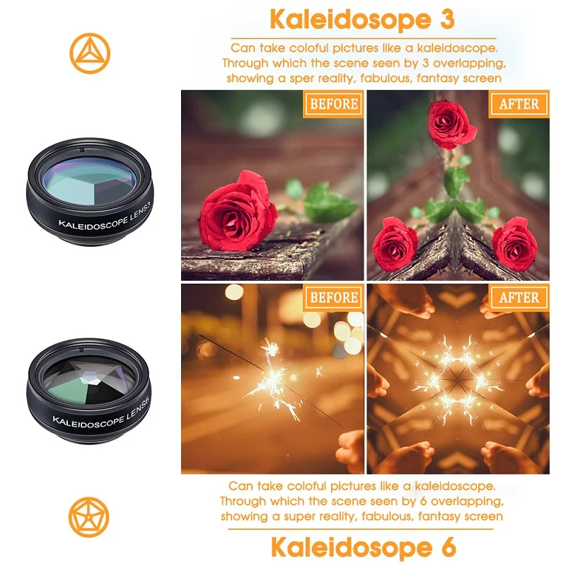 Включая десять линз для мобильных телефонов: Объектив рыбий глаз, широкоугольный объектив 0,63x, макрообъектив 15X, объектив CPL, объектив калейдоскопа 3, объектив калейдоскопа 6, объектив фильтра потока, объектив радиального фильтра, объектив звездного фильтра и объектив телескопа