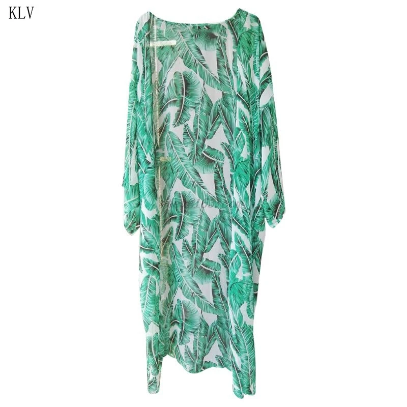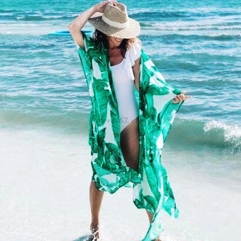 Женское, летнее, шифоновое полупрозрачное газовое длинное Кимоно Кардиган Топ белый с зеленым тропических банановых листьев кирпичная стена напечатанный Bikini Cover Up 3/4 SlПляжная одежда с открытой передней частью