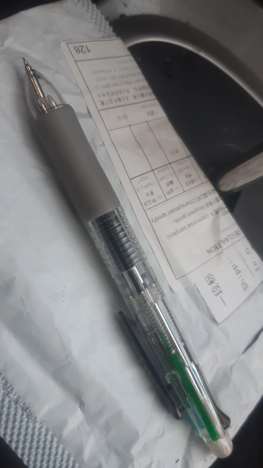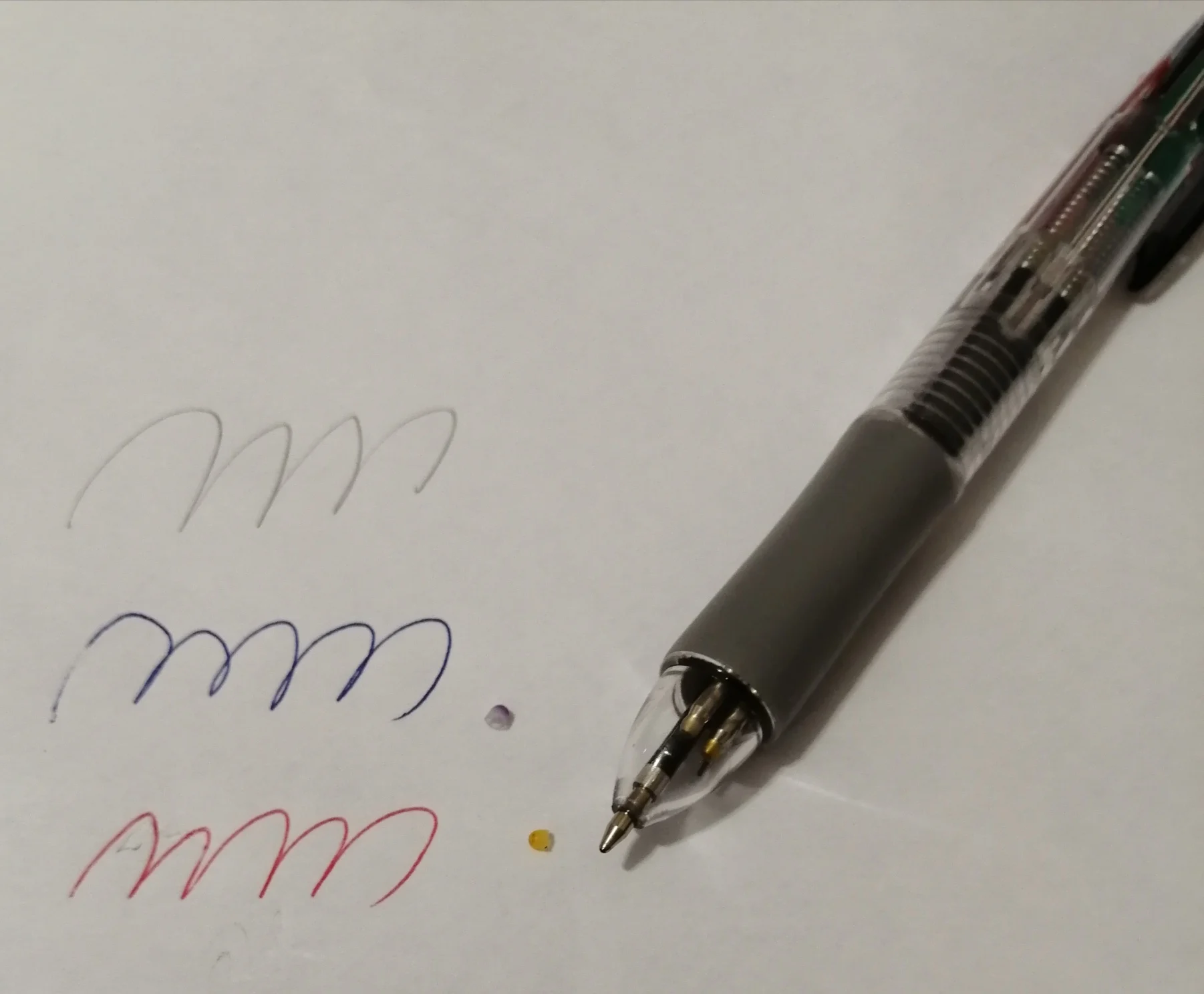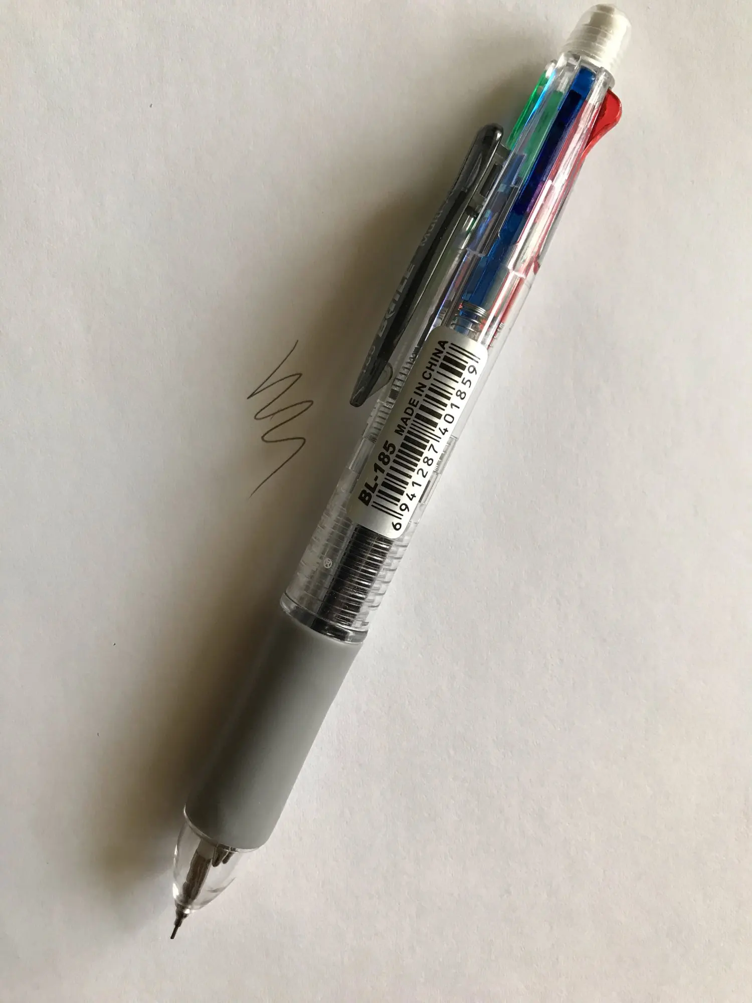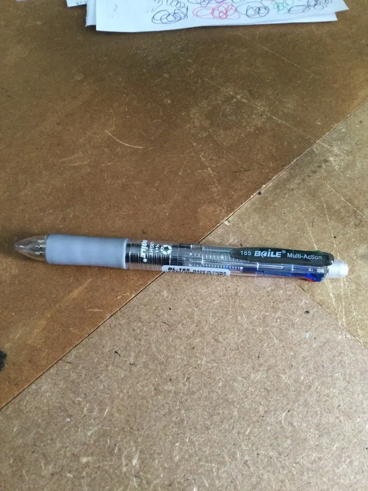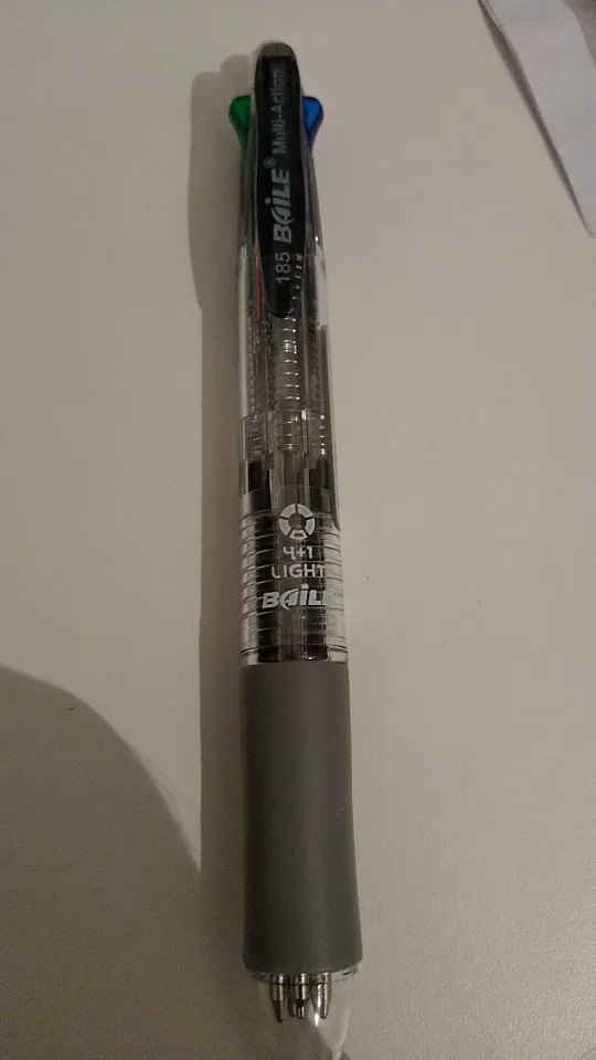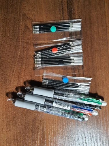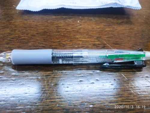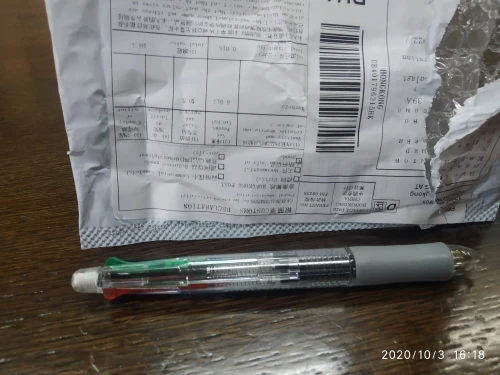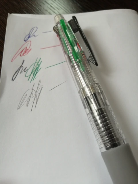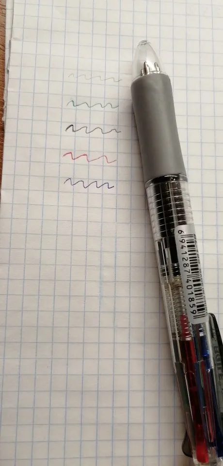 Посылка шла три недели. Все четыре цвета пишут нормально. Карандаш не писал - сломался стержень. Пришлось разбирать ручку, вытаскивать обломок и заново вставлять. Стержни диаметром 0.5 и очень хрупкие. Придётся закупить запасные стержни. К ручке прилагается два коротких стержня.