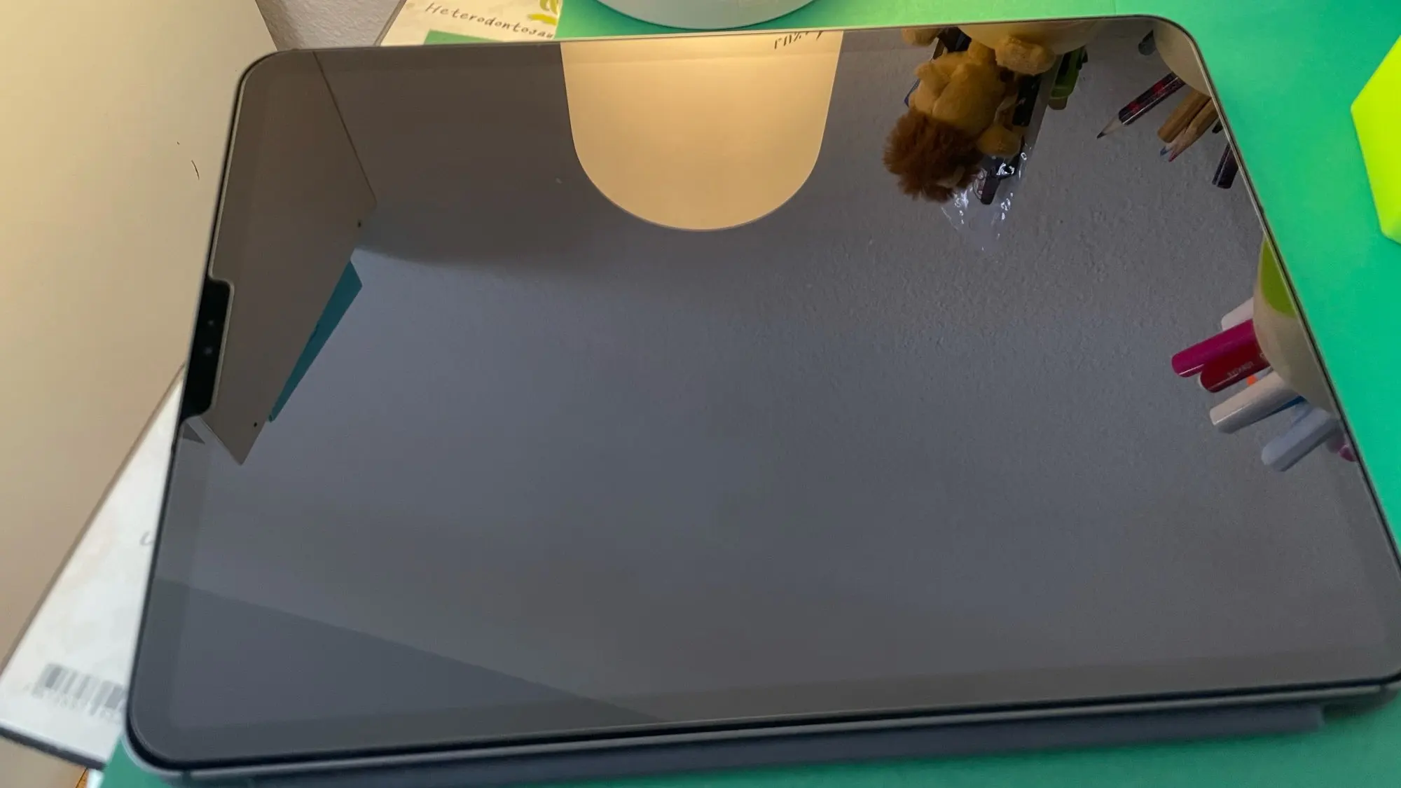 Он очень хорошо защищен, но все же немного сломан рядом с отверстием кнопки. Как три приходят, потому что я смог поставить еще один и оставить защитное стекло iPad, которое мне уже пришлось поменять его на разрыв. Экран очень хорошо работает с закаленным стеклом и хорошо прилипает без пузырьков. Он поставляется с салфетками для очистки экрана, сушки и наклейками для удаления пыли на случай, если есть какой-либо мотоцикл, чтобы удалить его, и он идеален