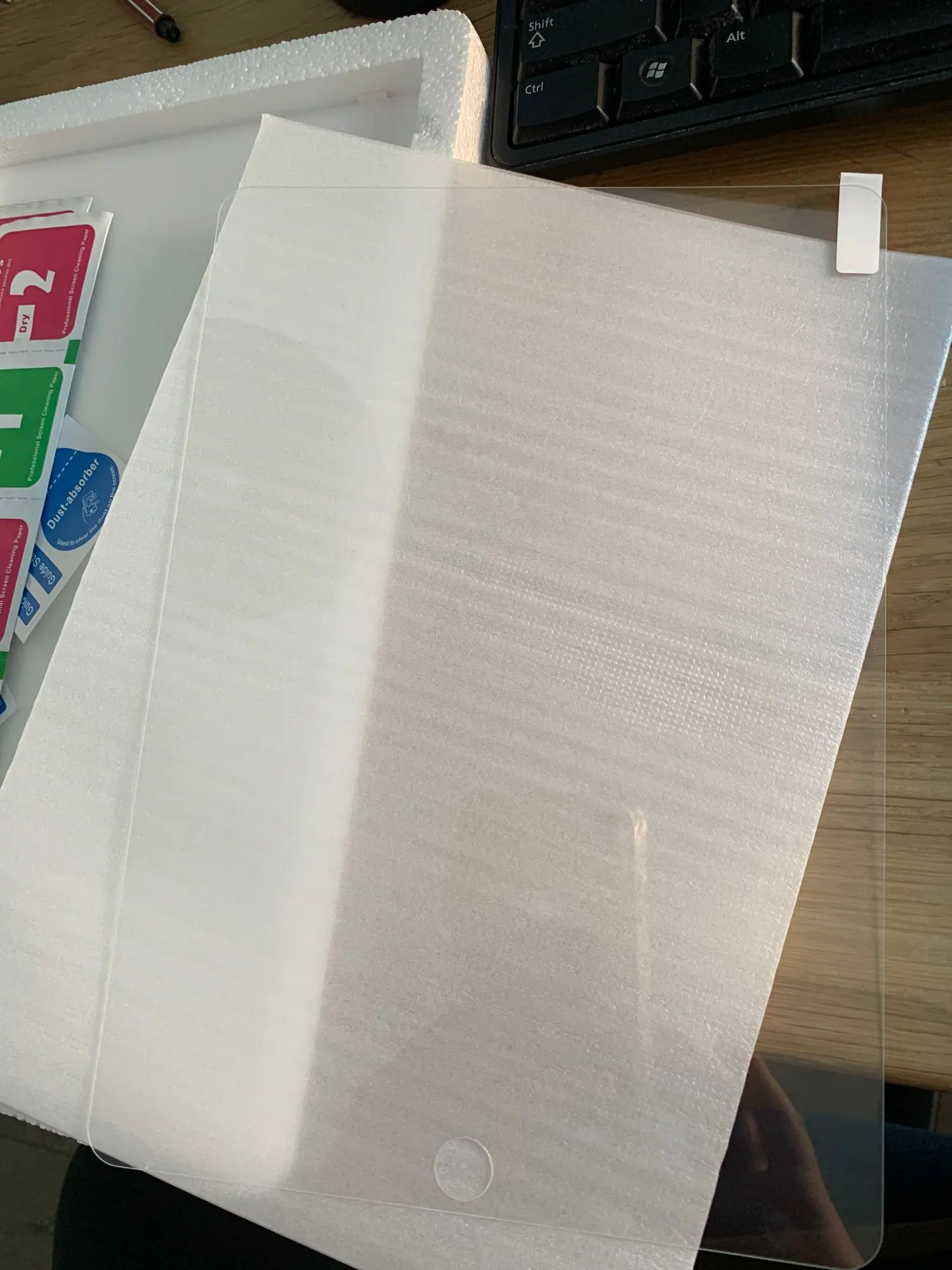 Хорошо упаковано и в идеальном состоянии. Легко наносится и без пузырьков. Не так хорошо, как очки для мобильных телефонов, но вполне разумно.