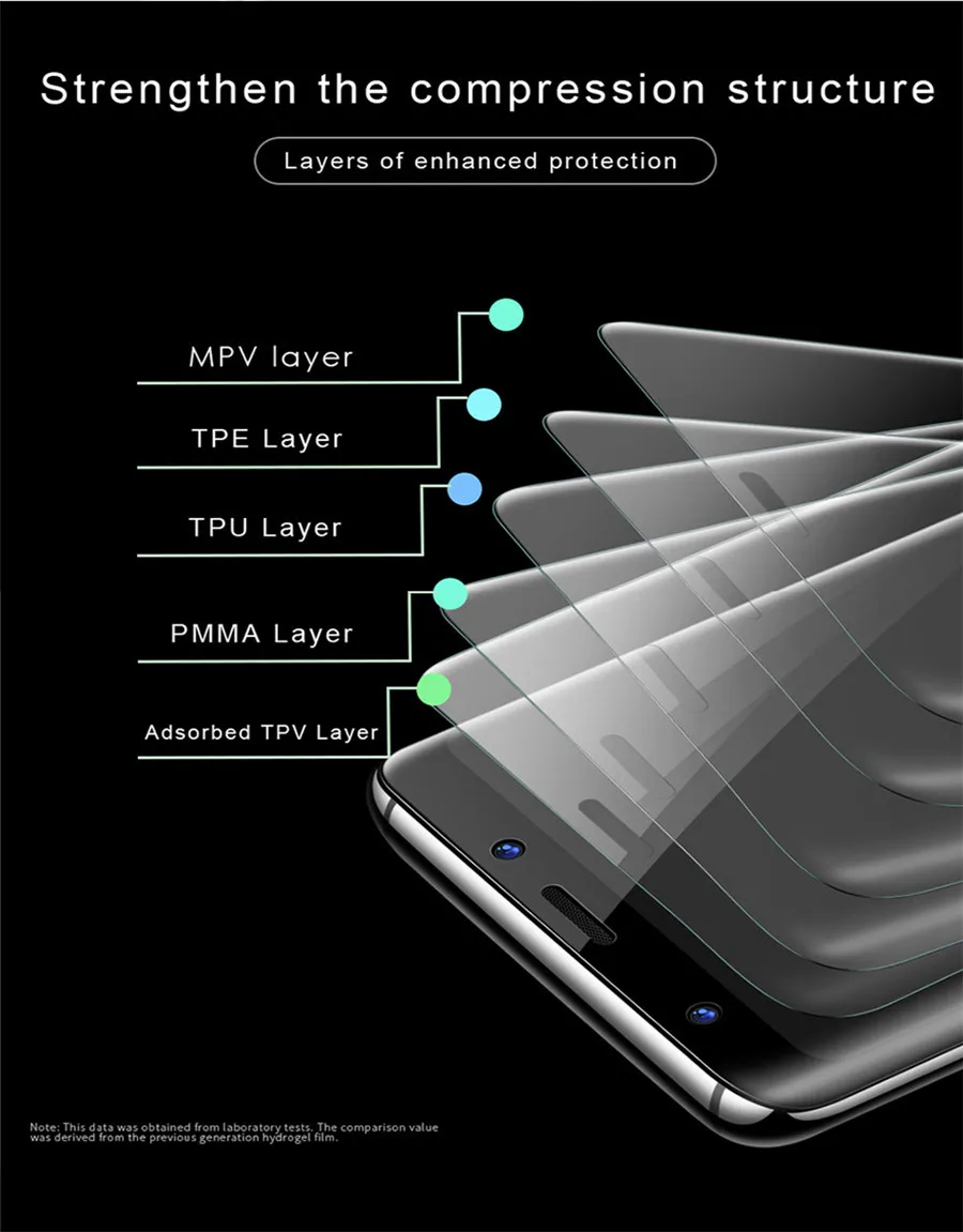 1) Устойчивый к царапинам слой принимает все удары повседневного использования устройства. 2) слой амортизации принимает все удары и подушки для защиты экрана от повреждений. 3) слой памяти автоматически помещается на изогнутых поверхностях при нанесении тепла 4) адгезивный слой состоит из передовой технологии кремниевого материала, который имеет возможность выхода пузырьков воздуха и многоразового использования после многократного применения 5) Максимальное поглощение ударов 6) Защита от царапин 7) Стретч-сопротивление 8) Нескользящая ручка 9) Воздушный пузырьковый клей