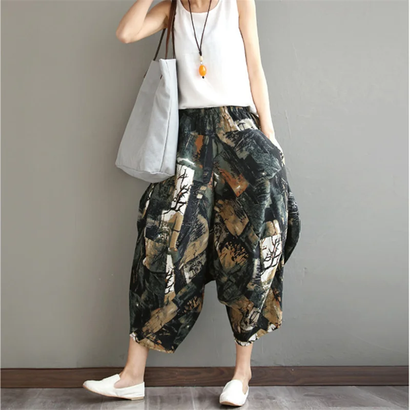 Брюки с принтом в китайском стиле, брюки длиной до щиколотки, женские свободные брюки из хлопка и льна с эластичным поясом, народные брюки по индивидуальному заказу
