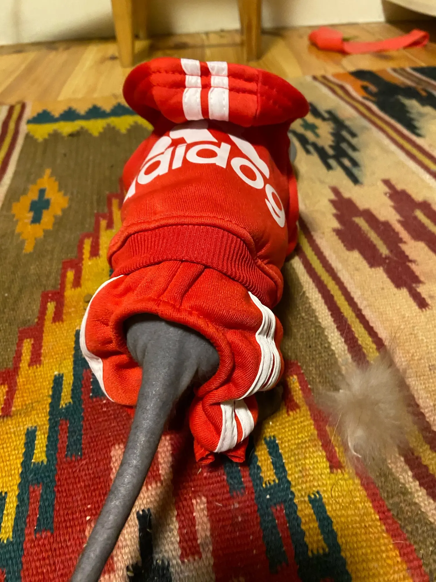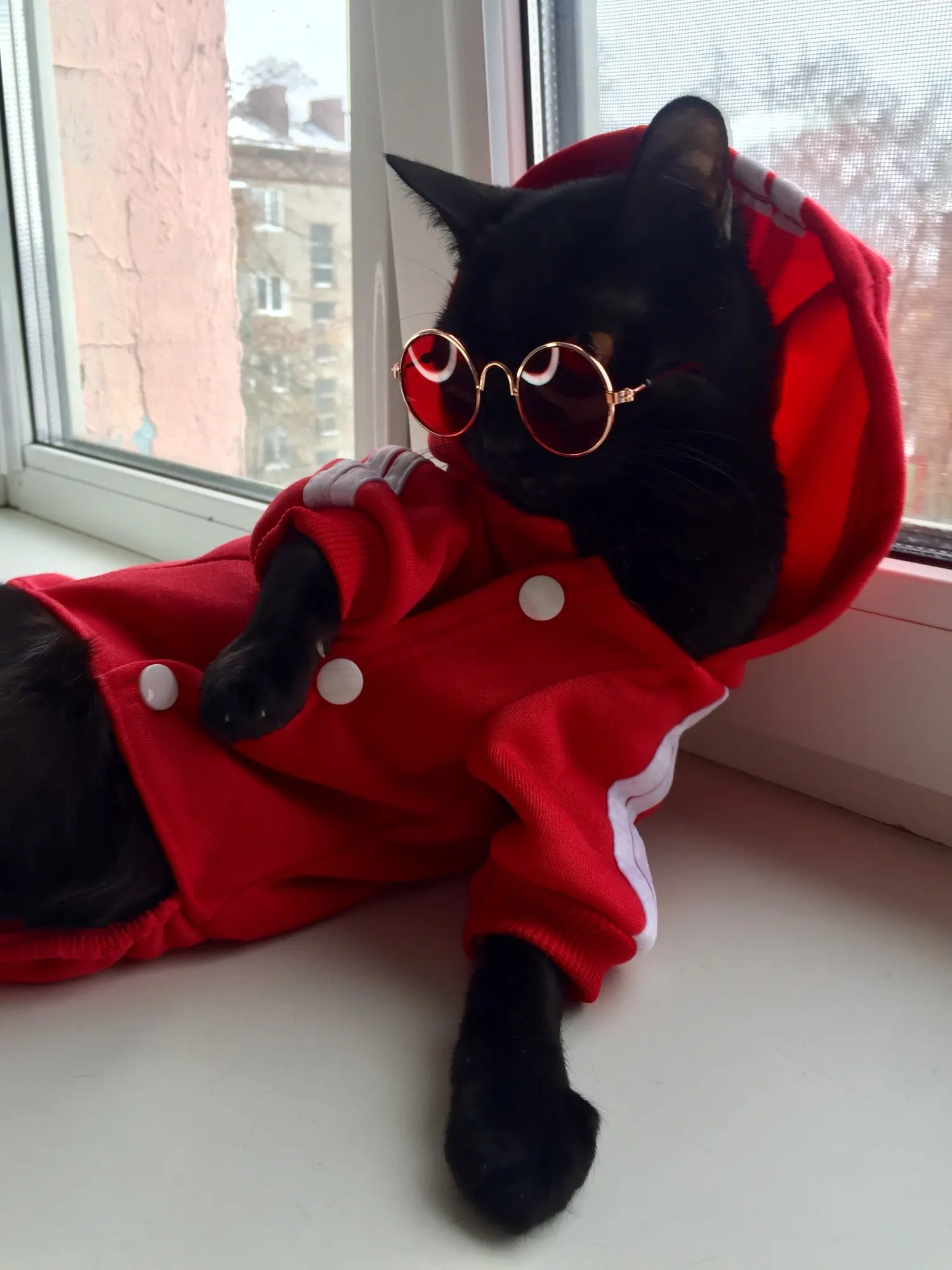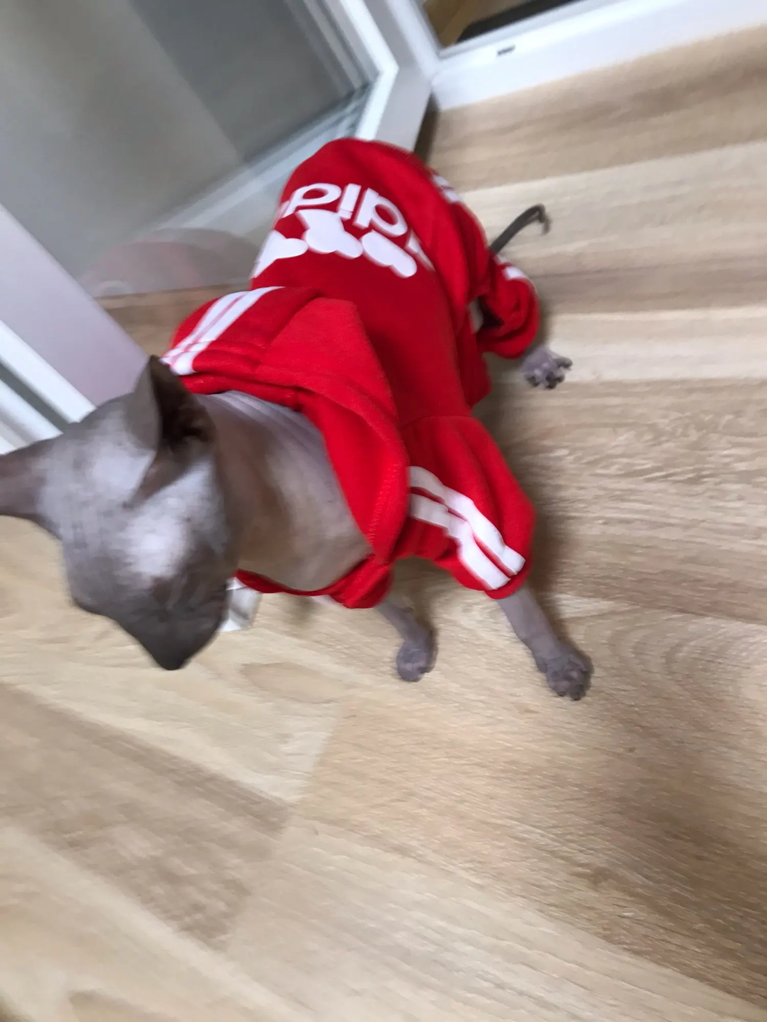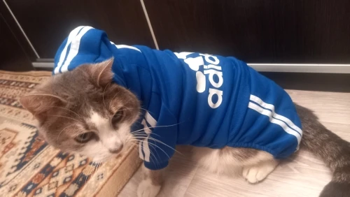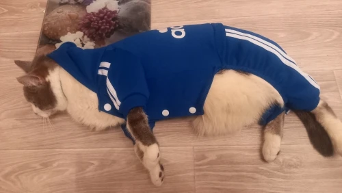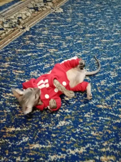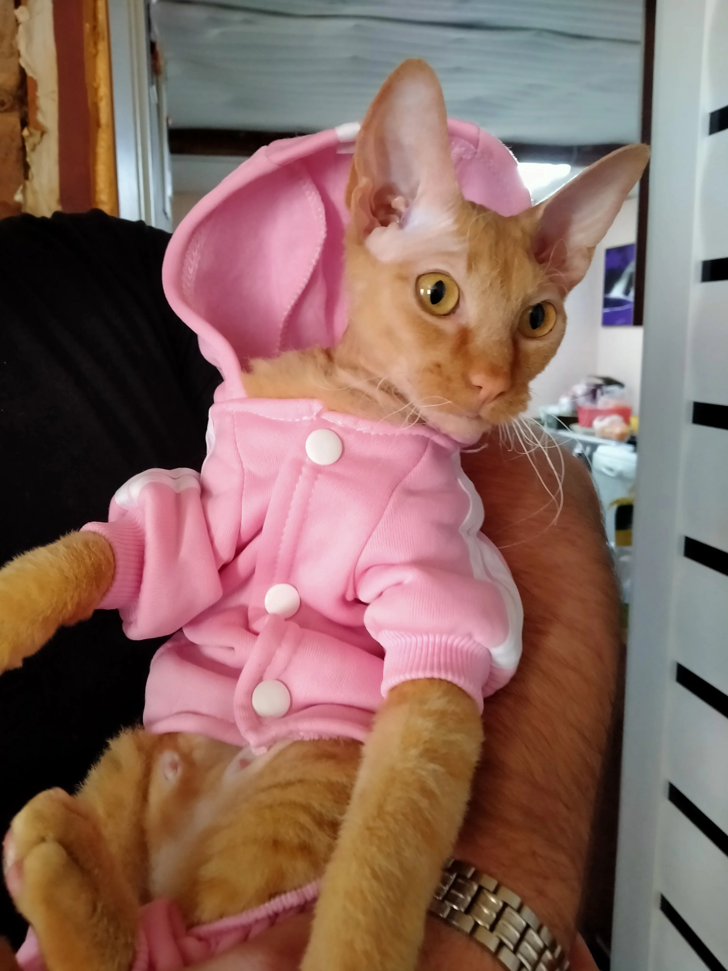 Костюмчик очень хорошенький, но размер М для трехмесячного котёнка чуть большевата, но ничего вырастет.