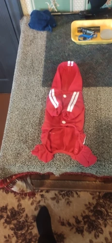 Костюм выглядит так же, как на картинке. Моя кошка, которая обычно носила свитера, полуприемлимая одежда. Размер был хорошим, но брюки имитируют хвост, поэтому я их отрезала. Теперь Толстовка без штанов работает, но не подходит как для штанов. Определенно стоит того, чтобы смеяться. Выглядит забавно :)