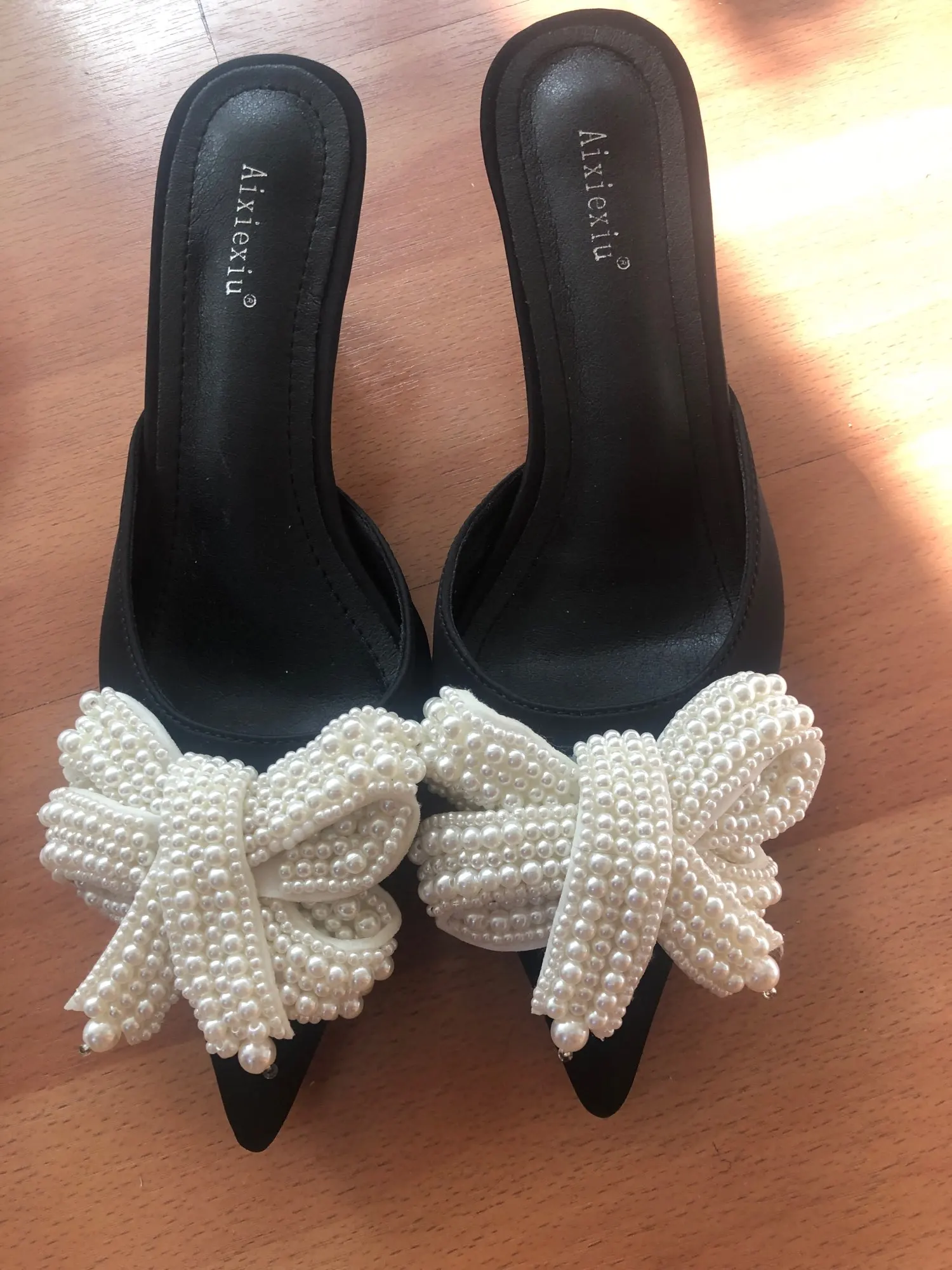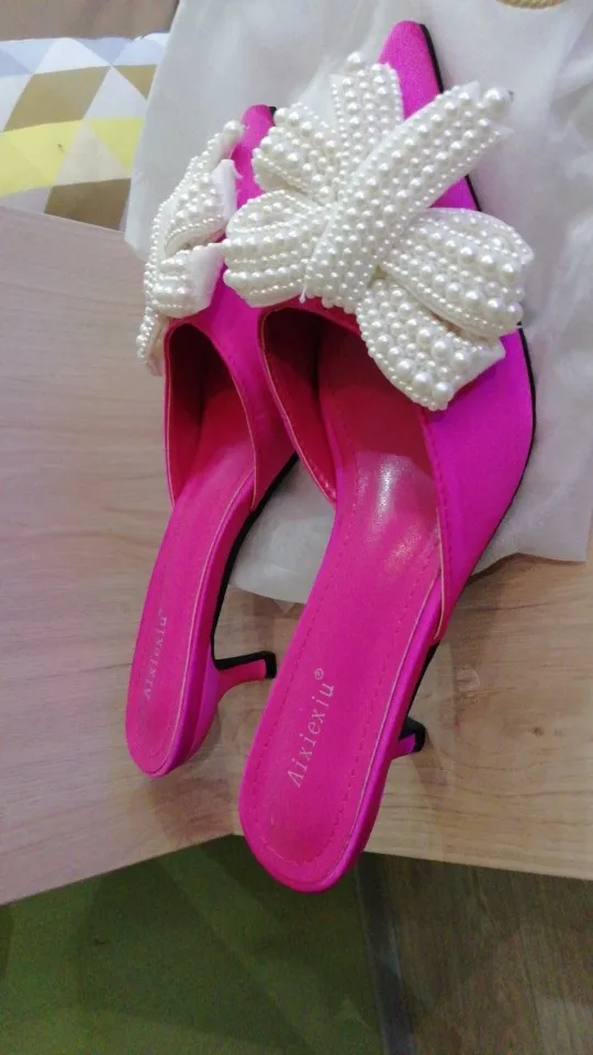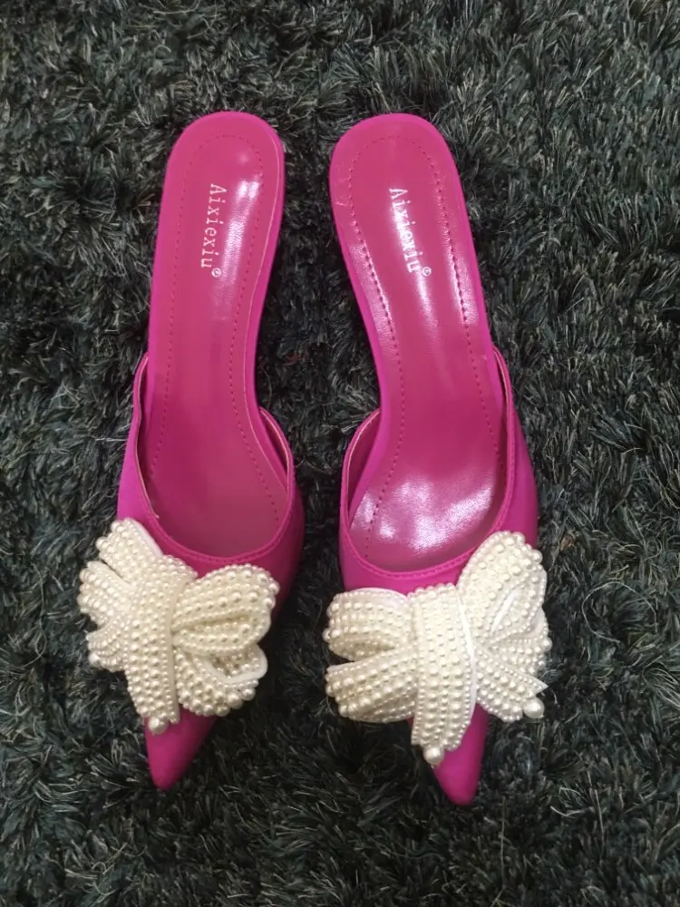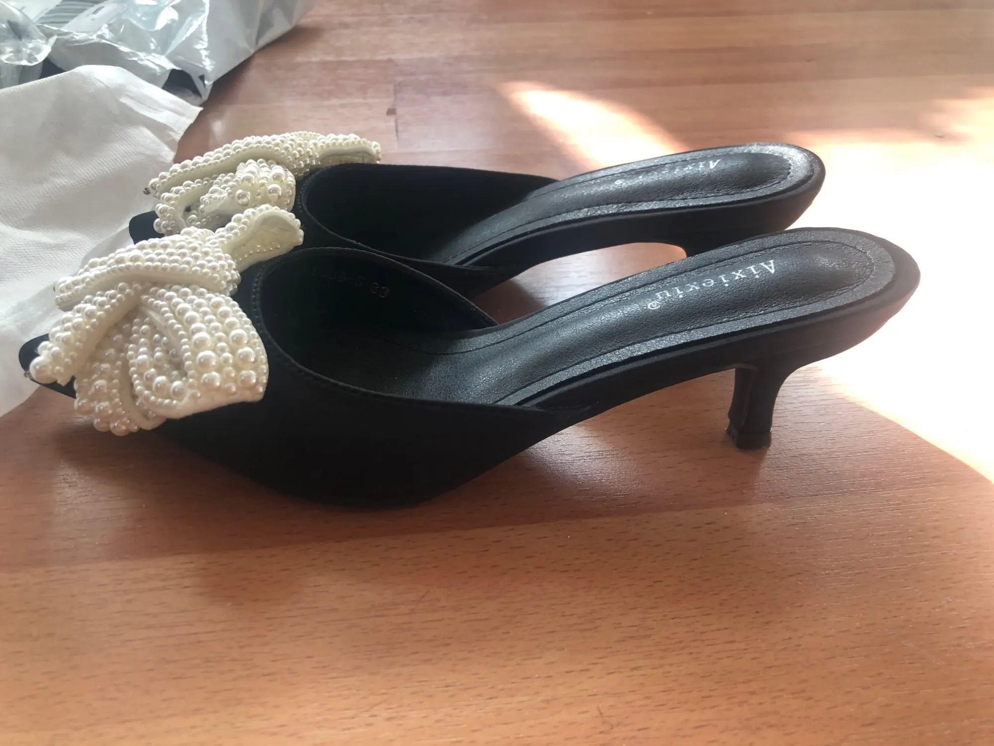 Fabulous mules! The pearl bows are big and pretty , they make the shoes look so lovely and elegant, exactly as pictured on the seller’s site. They are comfortable and well made with good quality material. I am already thinking of buying the other color. The thoughtful Seller packed it very well for protection during delivery, it was packed inside hard bubbles pack and delivered fast within 10 days! Five stars to the Seller and the product.