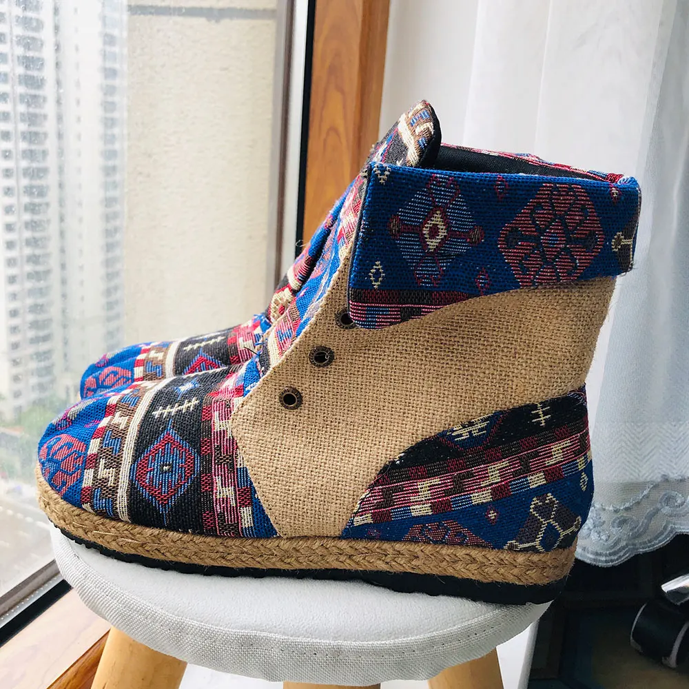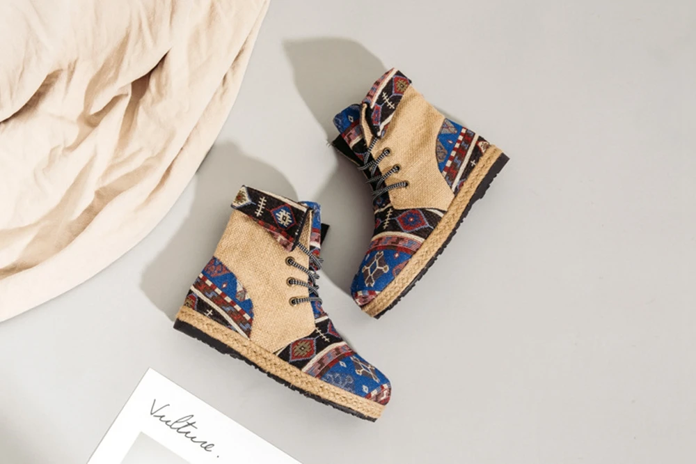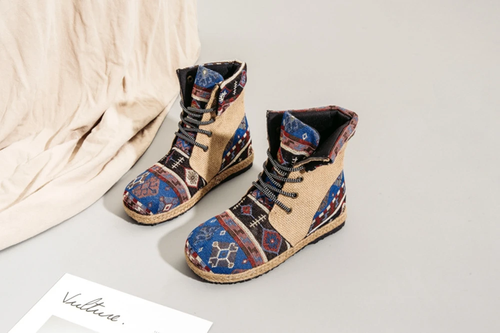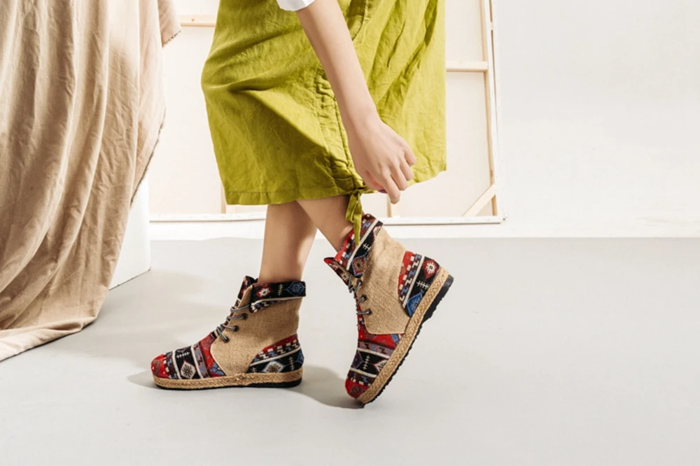 Женские льняные хлопковые ботильоны Veowalk в стиле Харадзюку с вышивкой, удобные женские ботинки на шнуровке, на плоской подошве, эспадрильи, обувь для веганов