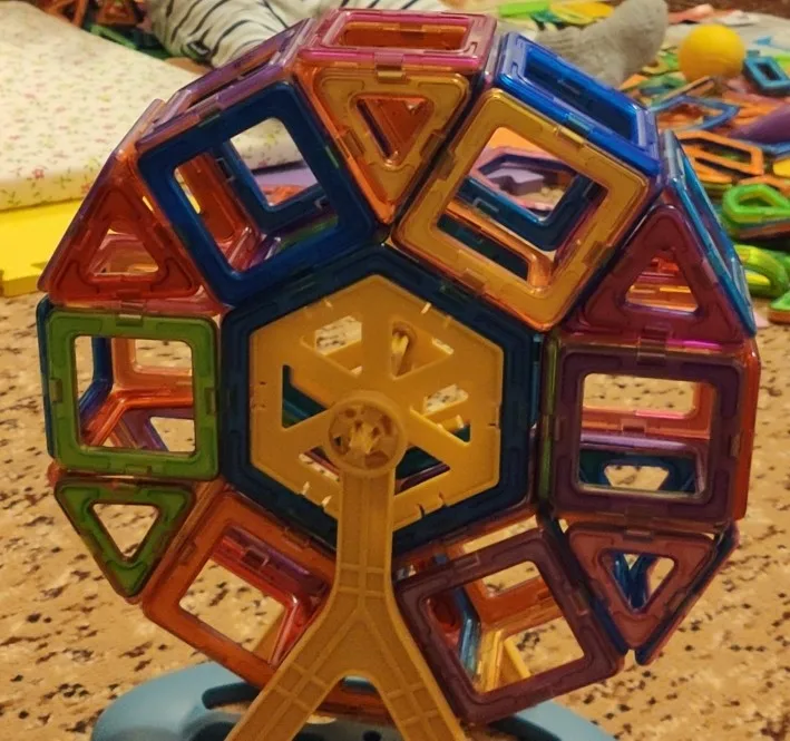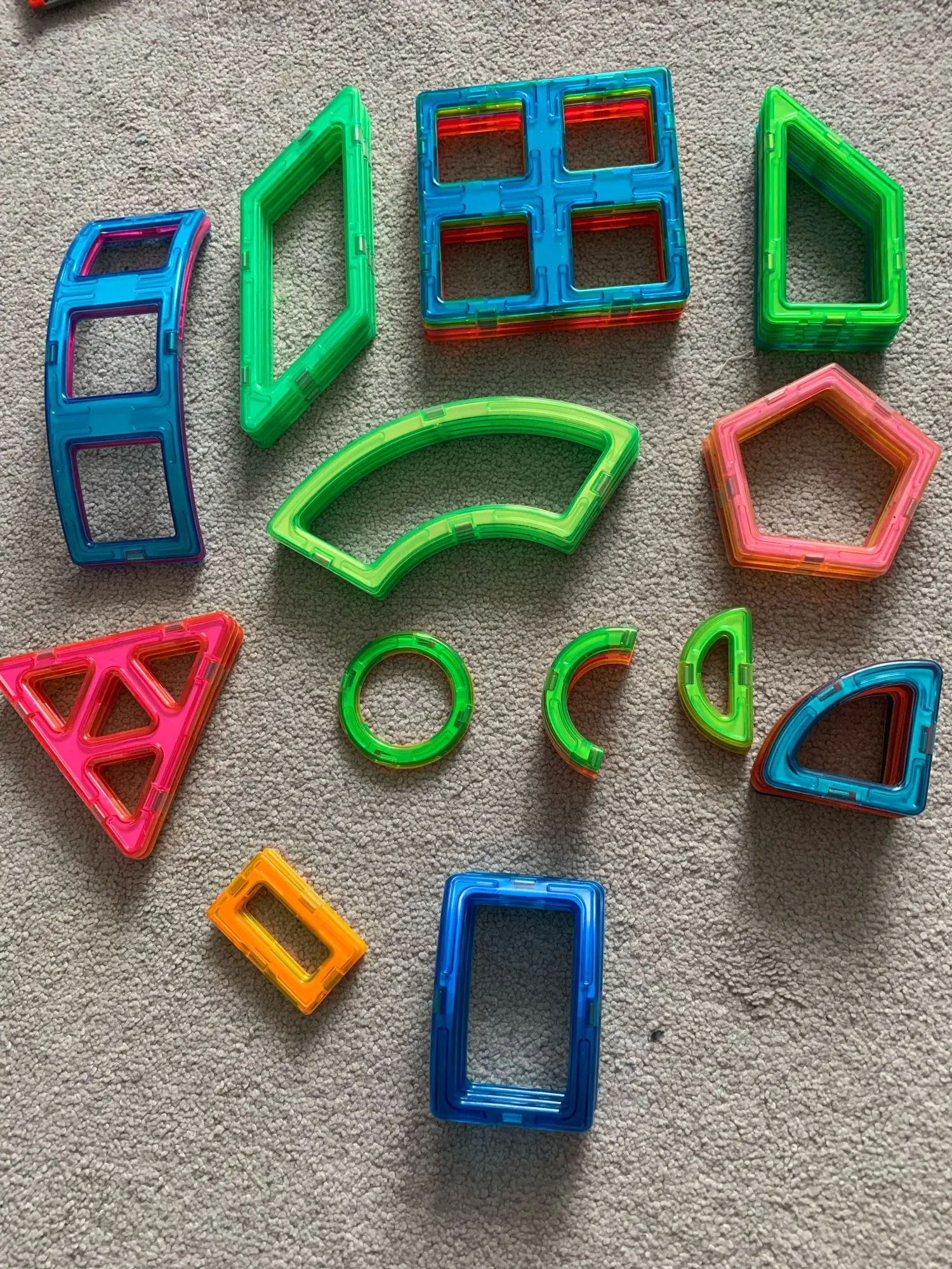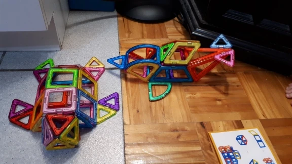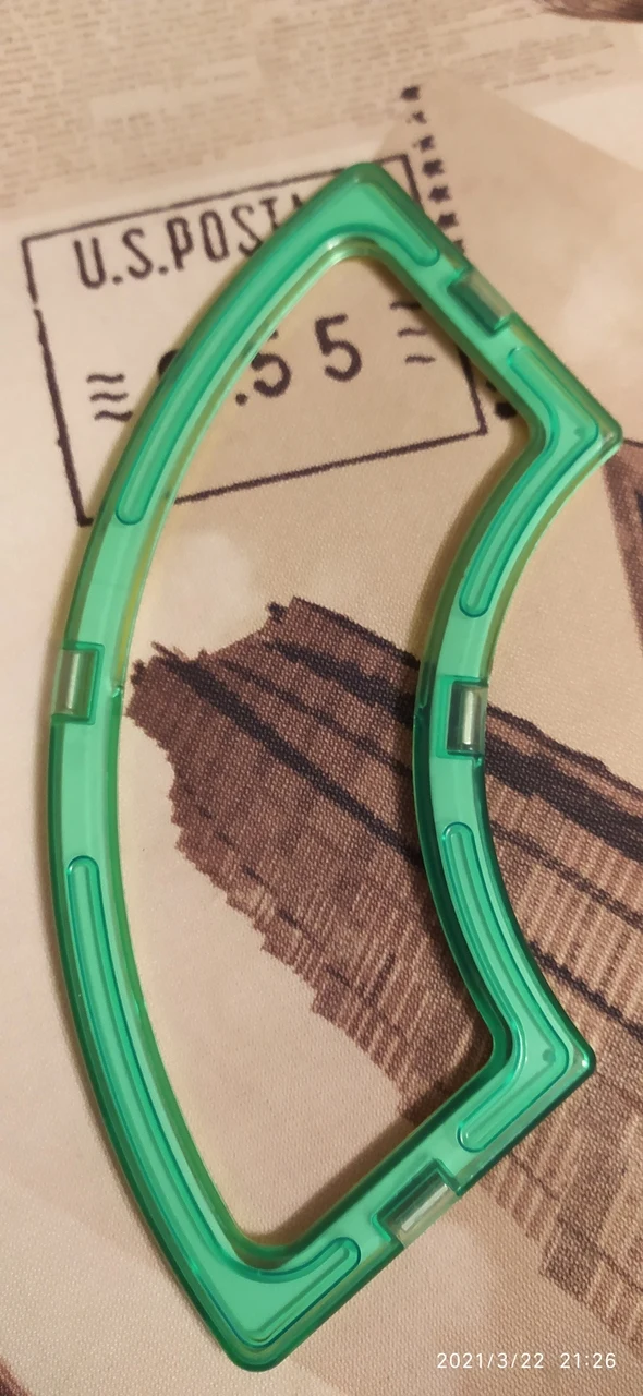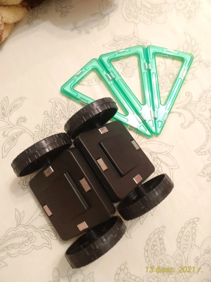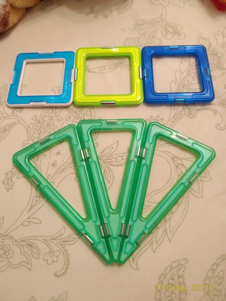 Брала три треугольника и колёса. Колеса хлипенькие конечно, но за такую цену претензий нет. Треугольники напоминают магникон, на фото квадраты слева направо magformers, бондибон и магникон для сравнения с треугольниками. Они норм. Доставка быстрая, пару недель, пришли несколько посылок в одной.