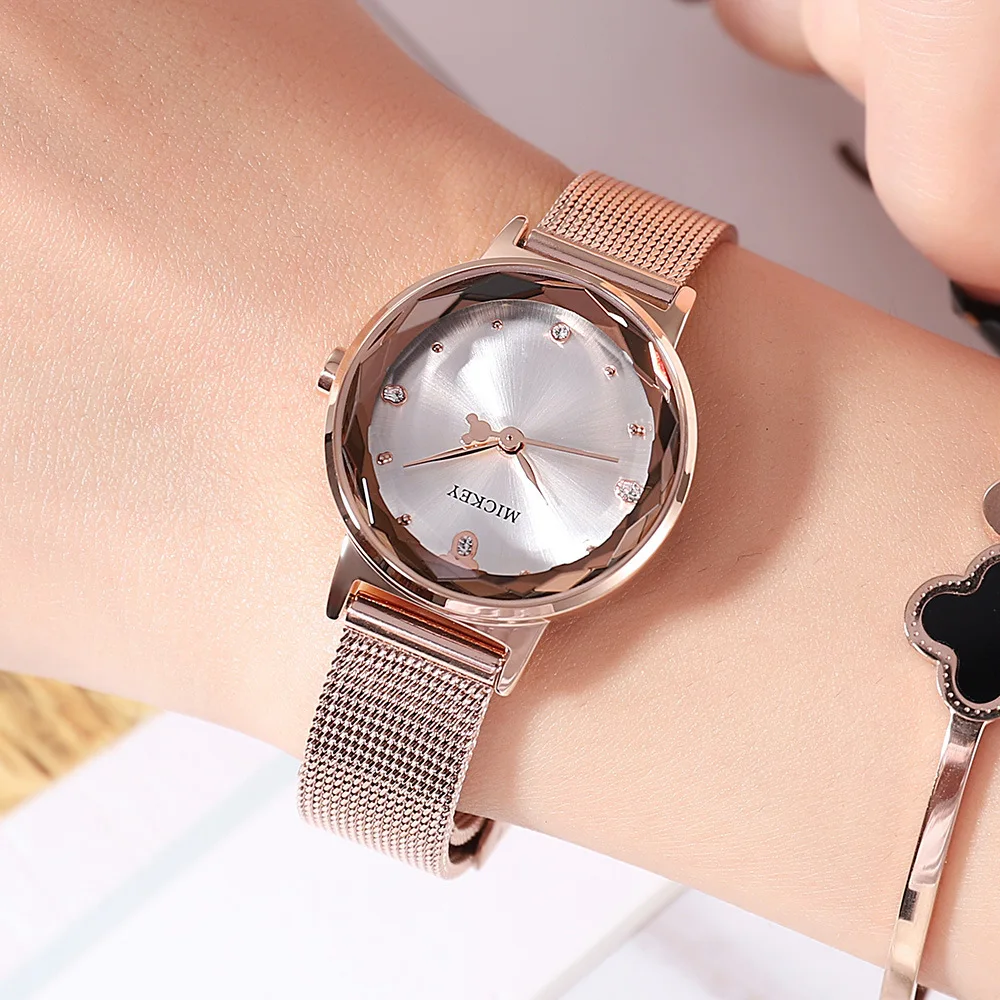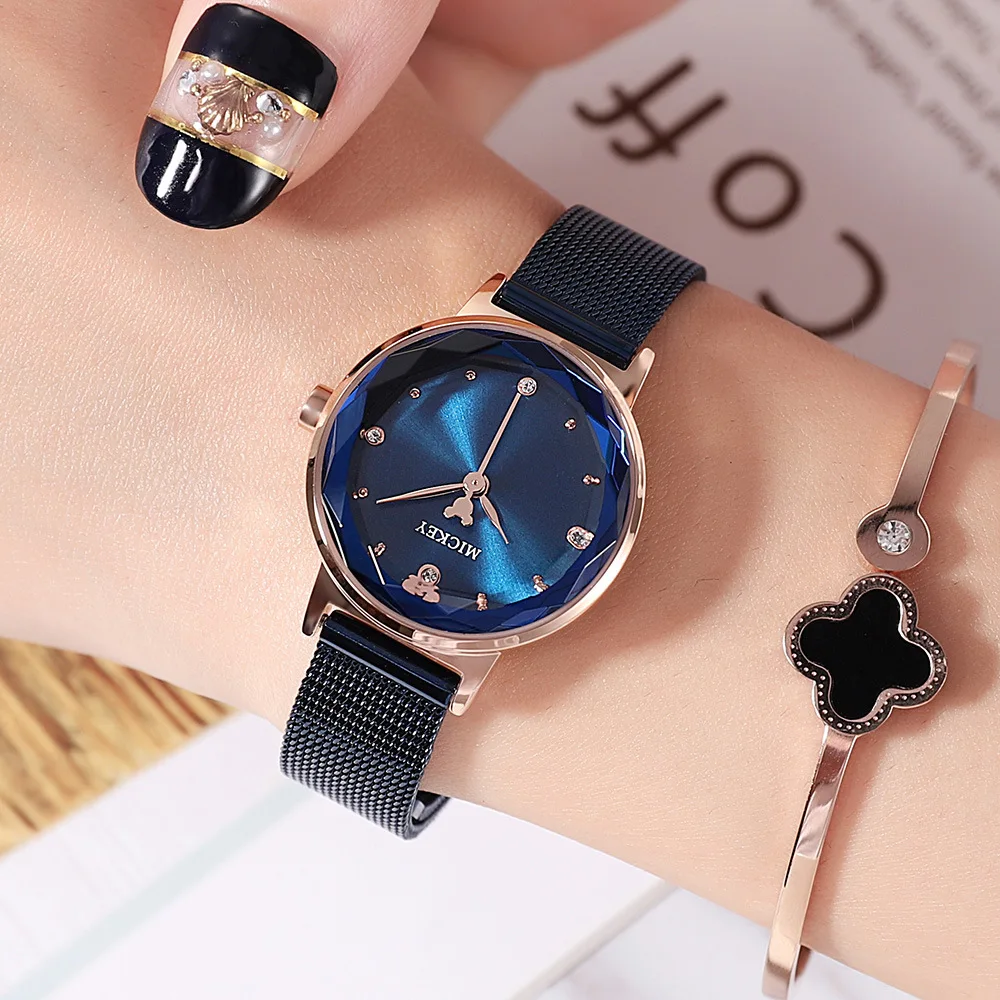 Часы Disney из нержавеющей стали с розой и золотом, модные простые часы с сетчатым ремешком Микки Мауса, часы Miss Lingjing 349