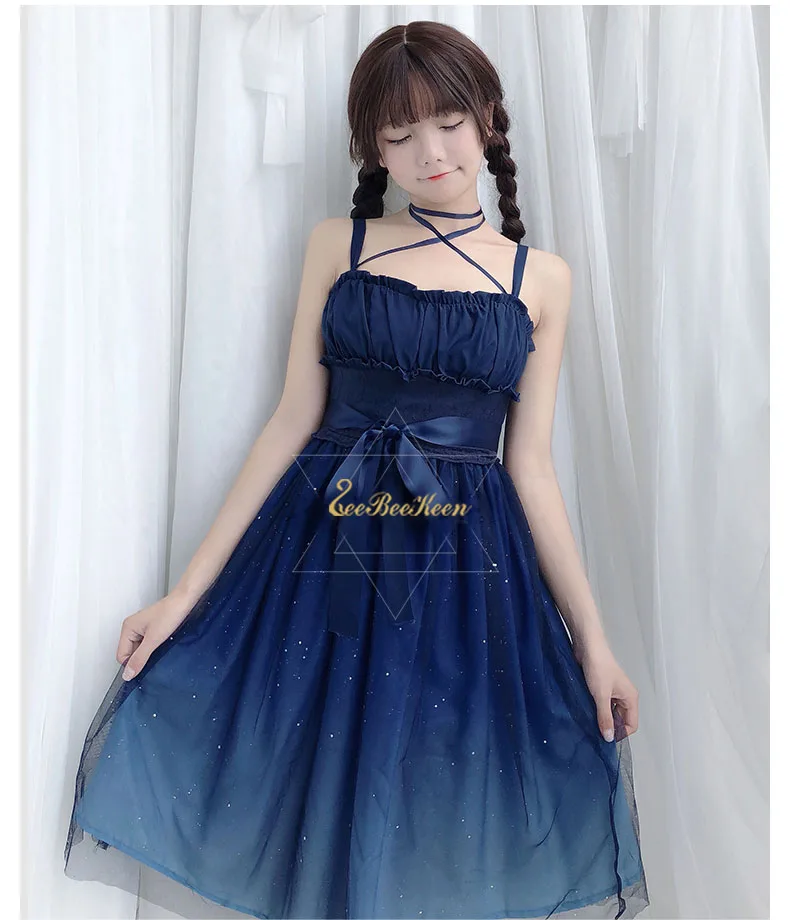 Женское шифоновое платье-ханьфу, голубое, с градиентом звездного неба, JSKLolita, кружевное платье для девочек, Милая юбка в стиле Хань Тан