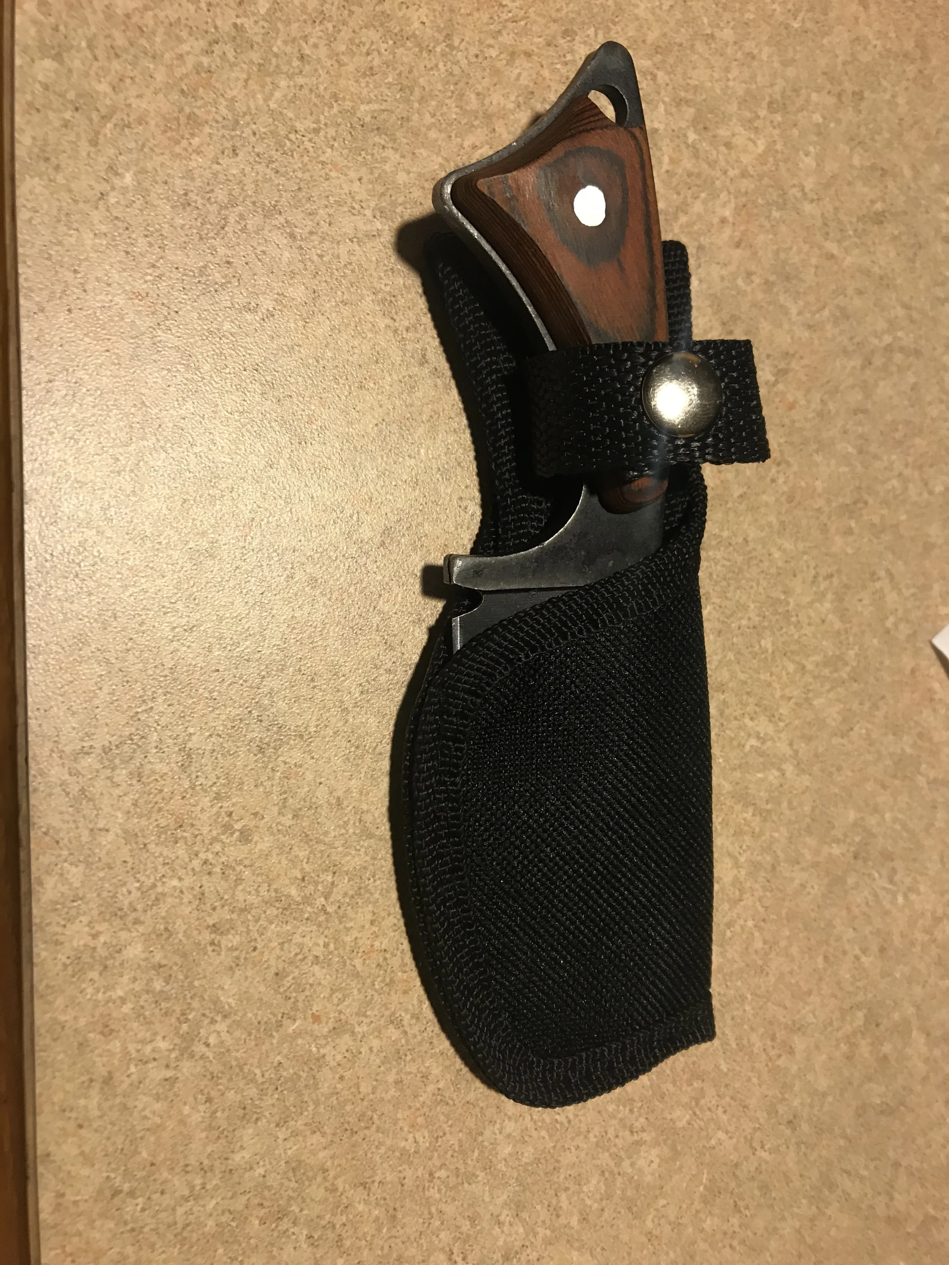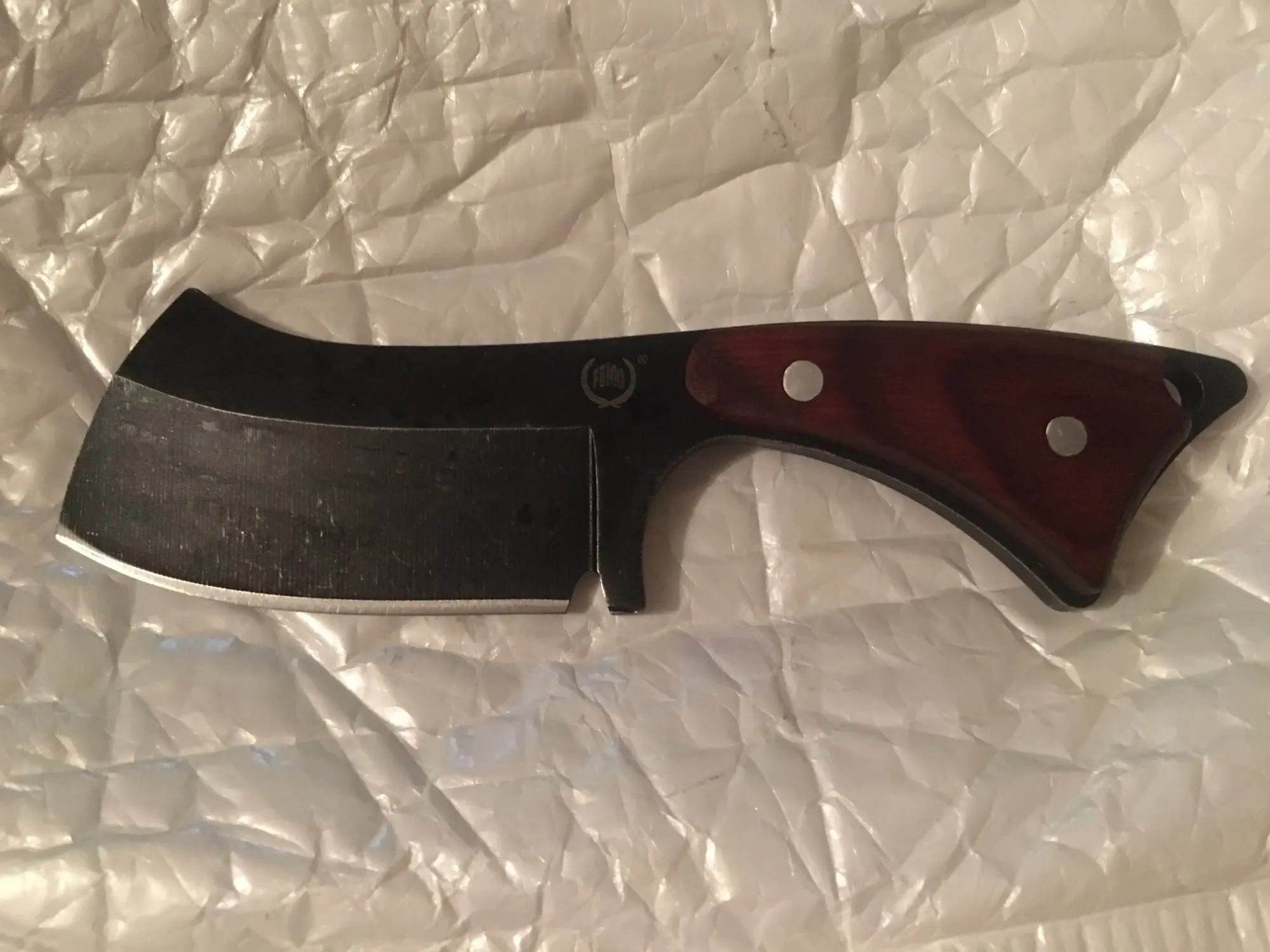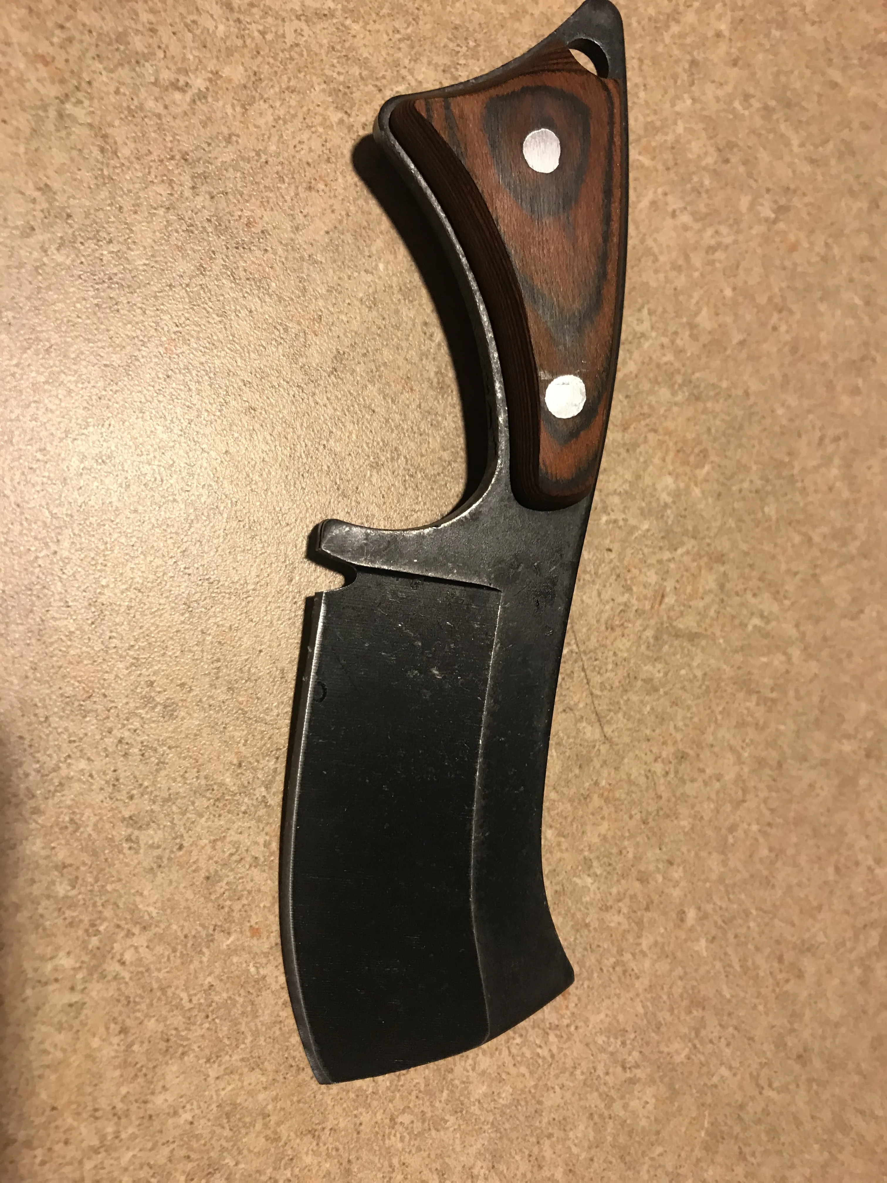 Нож массивный, ручка немного болтается на заклепках, но не критично. Ножны более-менее приемлемые, но планирую сделать новые из кожи.
