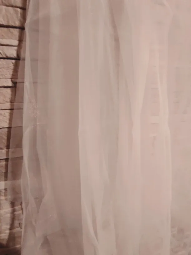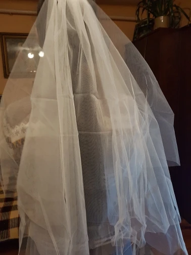 Вуаль очень милая, сделана прочно. Подходит для свадебной одежды. Фатиновая ткань, аккуратная, прямая, не видна на концах. Тепло рекомендую. Доставка прочная, но нормальная :)