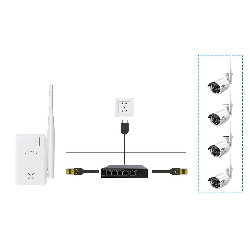 Сделайте проводную NVR систему таким же эффектом, как и Беспроводной NVR, поддерживает беспроводную IP-камеру. Поддержка функции беспроводного ретранслятора. Поддержка 2,4G wifi IPC. Быстрый код соответствия. Укажите состояние сигнала каждого IPC. Голосовой комментарий доступен в соответствии с кодом. Примечание: расширитель диапазона Wi-Fi работает только с беспроводной камерой безопасности Hiseeu