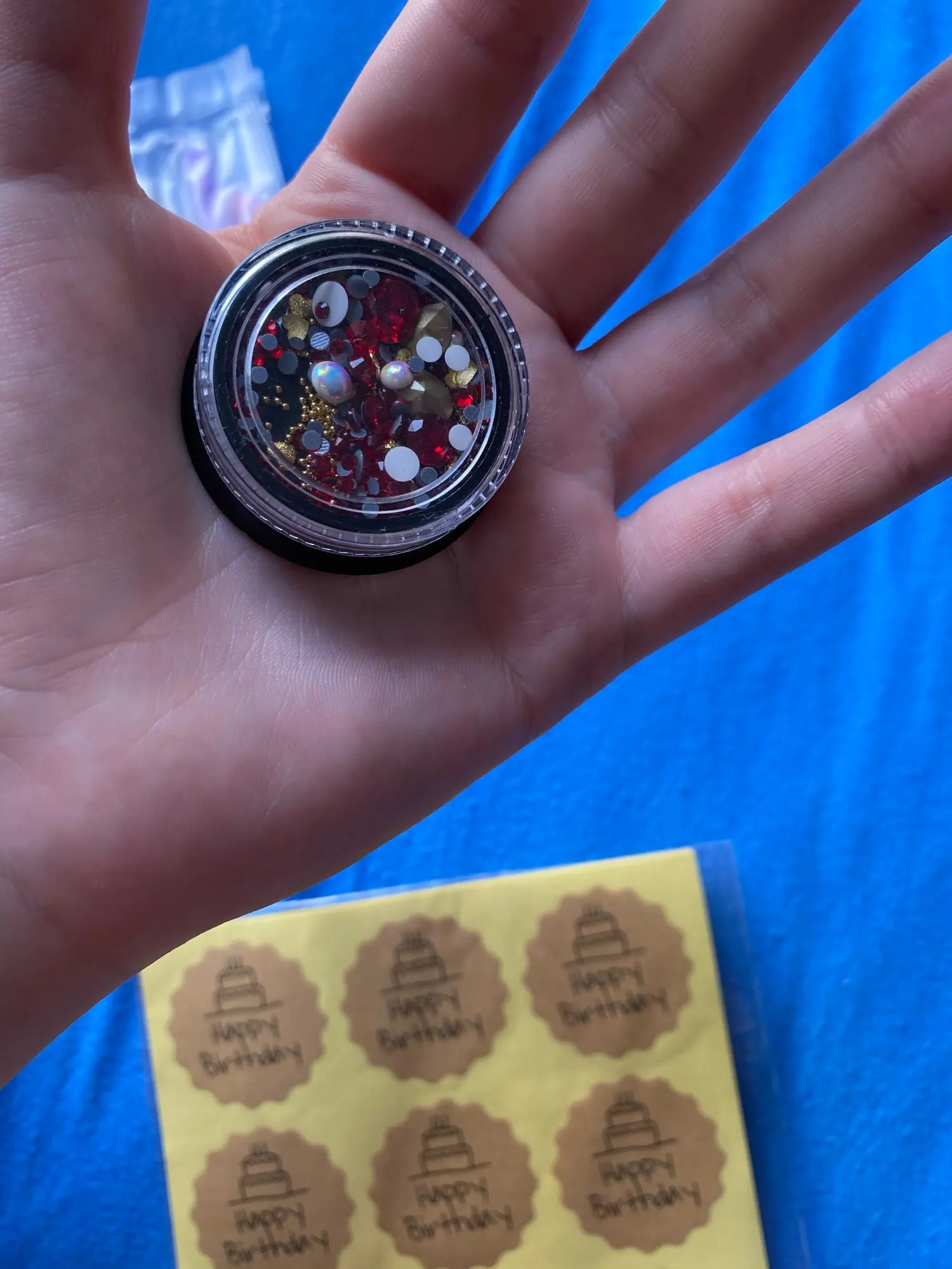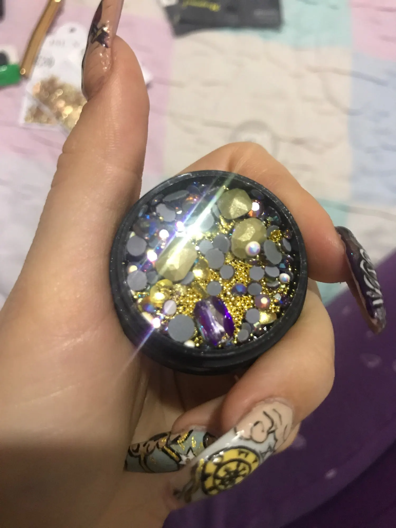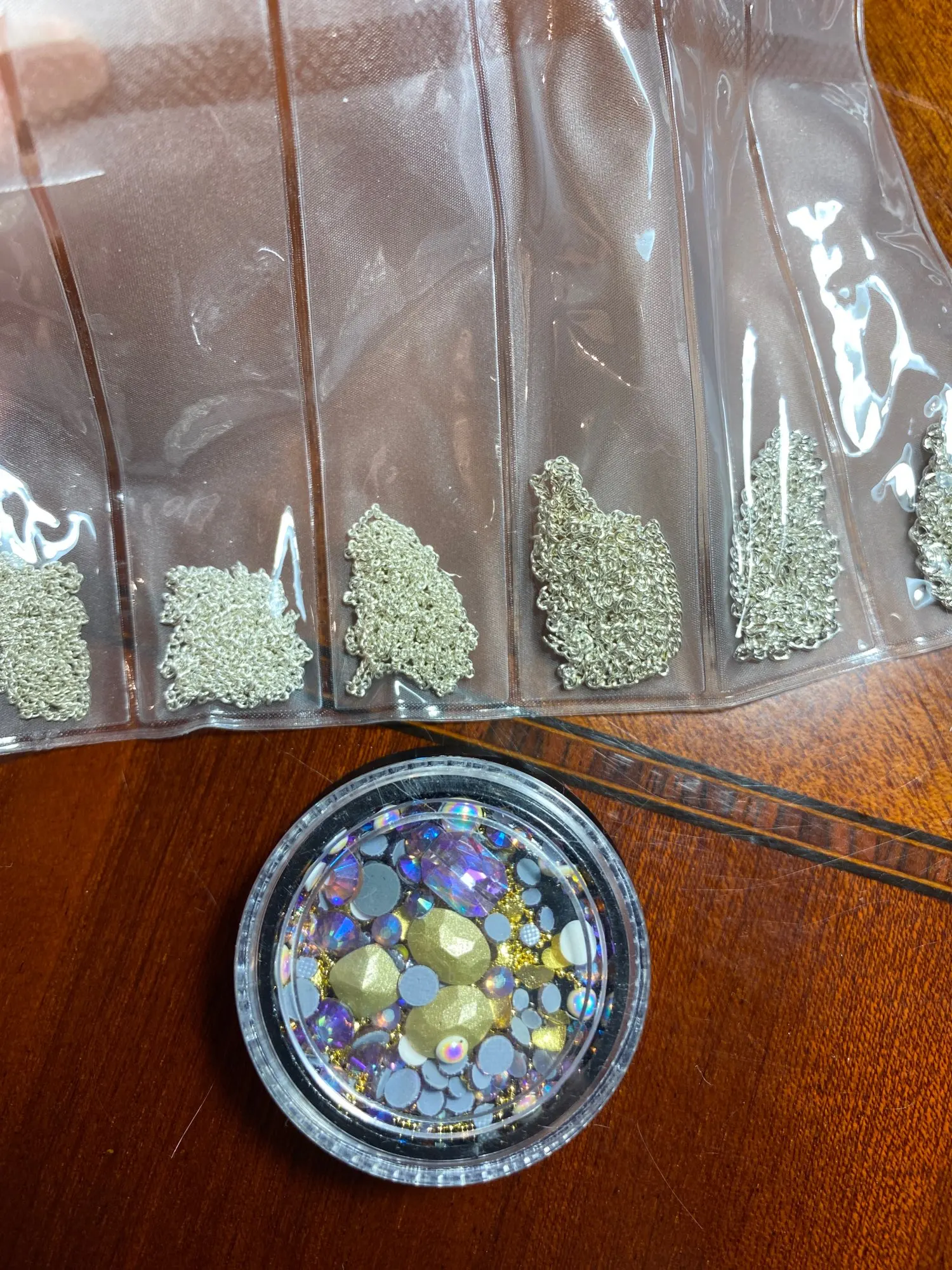 Такой классный набор чик, че в нем только нет. Есть и крупные стразы и мелкие и бульонки и разные мелкие детальки. Такие наборчики выгодней покупать. Обязательно найдётся, что наклеить на ноготочки. Покупайте не пожалеете.