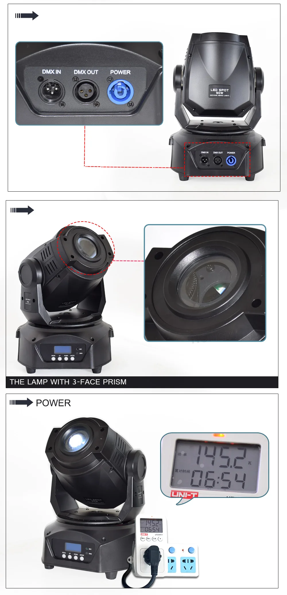 • Светодиодный прожектор с высокой выходной подвижной головкой• 1x светодиодный 90 Вт• Угол луча 13 градусов• Моторизованный фокус• 3 режима работы: звук активный,Режим показа и управление DMX• 4 встроенных освещения• 16 каналов DMX• 7 цветов + белый с половиной цвета + пятен• 1 вращающееся колесо gobo: 6 вращающихся gobos + 1 стеклянный gobo с прыжком и вращением• 1 статическое колесо gobo: 8 gobos + белый с эффектом скачка• Электронное Затемнение: 0% - 100%• 5 кривых диммера• Обратный режим панорамирования/наклона для контрастного движенияКогда приспособления соединены вместе• Быстрое движение наклона панорамирования• Панорама: 540 градусов; Наклон: 270 градусов• Эффект дрожания Gobo• 16-уровневая Fine Pan/Tilt контрольный• Пресс-форма-4-кнопка DMX светодиодный меню с 180 ° обратный режим просмотра• Шаговые двигатели с микрошаговым механизмом• Включает Омега кронштейн для крепления фермы• 3-контактный XLR Сделано в Китае внутрь или наружу• Охлаждение вентилятора• Эффект стробоскопа/импульса; Случайный стробоскоп медленного до быстрого• Светильник источник света: 1x90 Вт, холодный белый свет, светодиодный CT: 8500K• Длительный срок службы светодиодный (номинальная составляет примерно 50000 часов)• Многофункциональное напряжение: 100-240 В, 50 Гц/60 Гц• Потребляемая мощность: 140 Вт• Размеры (ДхШхВ): 230x230x340 мм• Вес: 9 кг. Посылка включает в себя1 x сценический светильник1 х вилка1 x Омега кронштейн2 винта1 x Руководство пользователя-