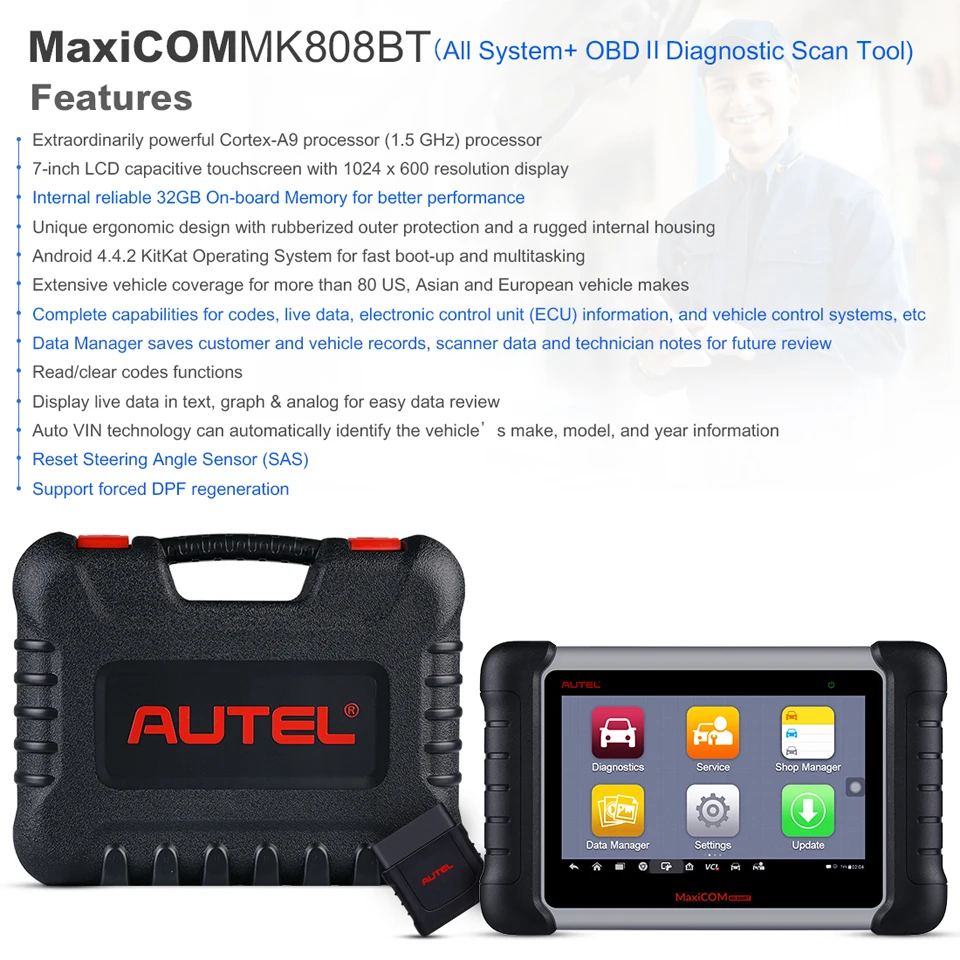 (1) обновленная версия Autel MK808/MX808 【беспроводной и USB разъемПрофессиональный сканирующий ИНСТРУМЕНТ Autel MaxiCOM MK808BT-это обновленная версия Autel MK808/MX808. Поставляется как с беспроводным VCI подключением, так и с подкладкой через USB кабель в комплекте. MK808BT позволяет получить доступ и диагностировать различные транспортные средства с рабочим диапазоном до 33 футов (10 м), без более коротких кабелей.