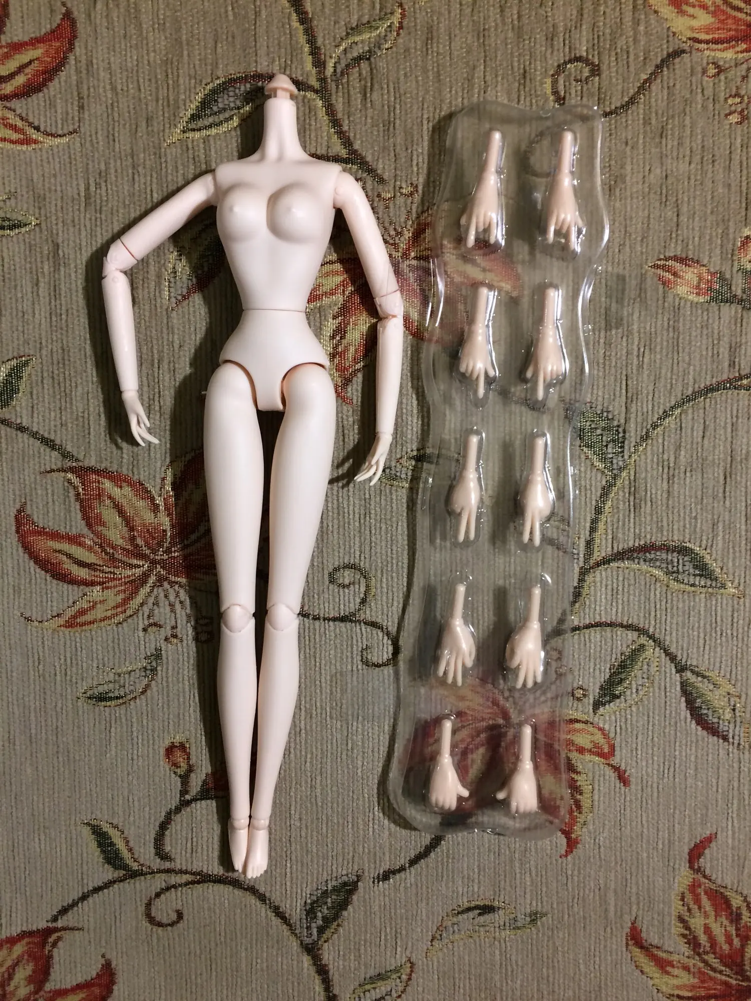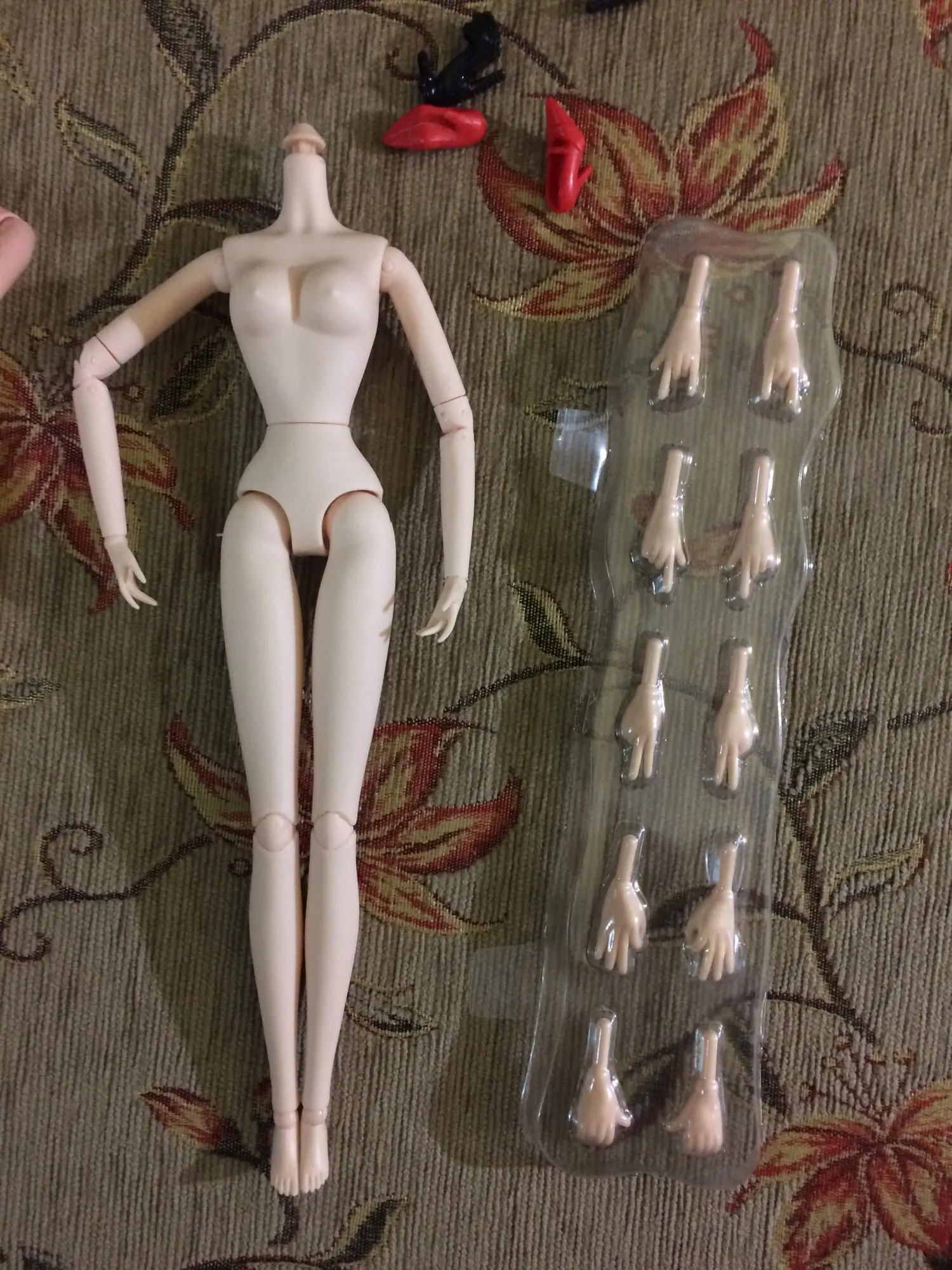 Тело шло с туфельками и руками, руки инородные, тело за свою цену оправдано, если берете на пробу, шарниры где-то тугие, где-то быстро ослабели, в локте вообще выпадает часть руки, но если вам нужно для витрины, это годно, если для ребёнка которому все равно во что играть годно, если как манекен или для фото тоже годно, но если вы придерживаетесь высокого качества ищите другое.