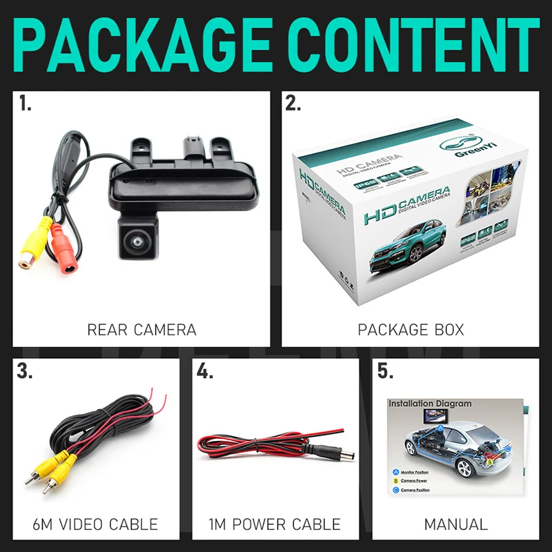 Спецификация:1. Датчик изображения: чип Sony/MCCD 14092. Телевизионная система: опция NTSC / PAL3. ТВ линия: 1000 ТВ линия4. Эффективные пиксели: 1280x720 пикселей.5. Ночное Видение при слабосветильник щении, ночное видение на расстоянии 15 м.6. Электронный затвор: от 1/50 до 1/100 000 секунд, от 1/60 до 1/100 000 секунд7. Видеовыход: в ПП, 75 Ом8. Баланс белого: Авто9. Питание: 12 В постоянного тока10. Длина видеокабеля: 6 м11. Длина кабеля питания: 1,5 м12. Подходит для DVD-плеера Android и любого монитора парковки автомобиля TFT и Carplay.13. Обрежьте зеленый провод. На изображении камеры будет отображаться парковочная линия.Посылка1. Камера заднего вида2 посылка3. Видеокабель 6 м4. Кабель питания 1 м5. Руководство пользователя
