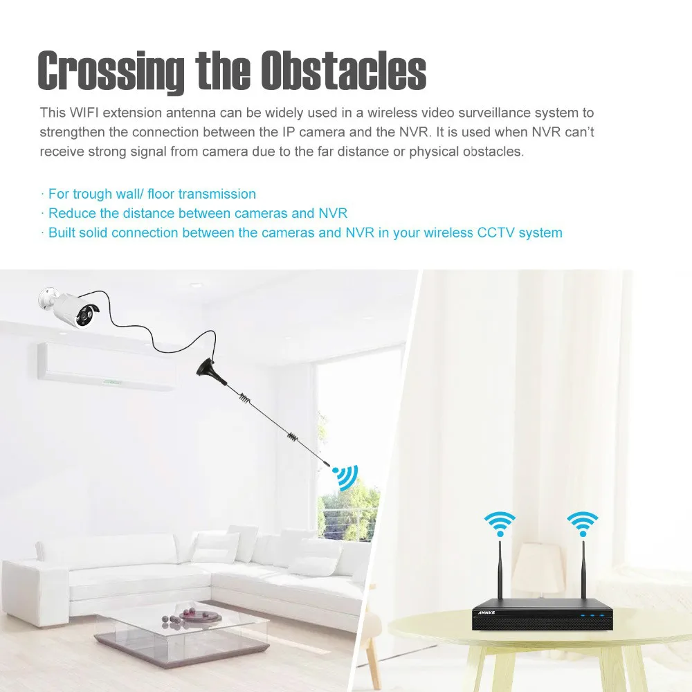 Эта удлинительная антенна WIFI может широко использоваться в беспроводной системе видеонаблюдения для укрепления связи между ip-камерой и NVR. Он используется, когда NVR не может получить сильный сигнал от камеры из-за дальнего расстояния или физических препятствий.
