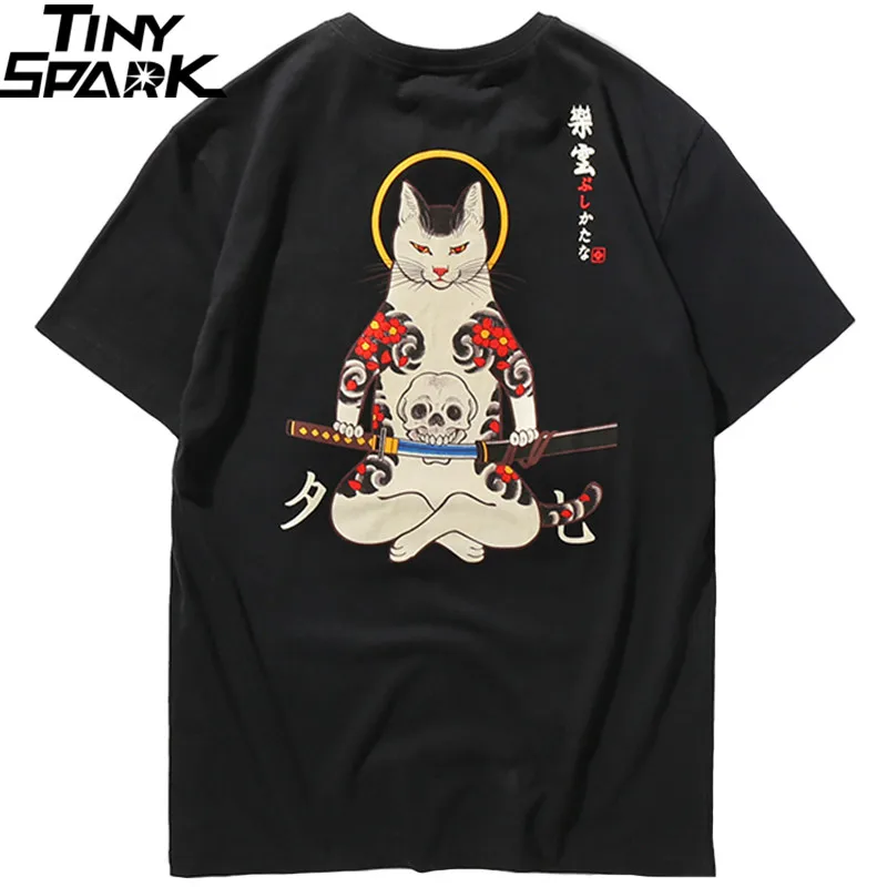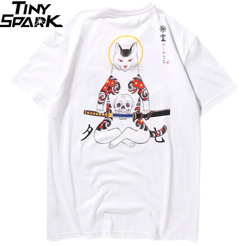 Футболка мужская в стиле Харадзюку, рубашка с рисунком черепа японского ниндзя, кошки, хип-хоп, уличная одежда в стиле укиё, лето футболка с вышивкой, 2021