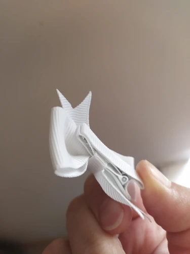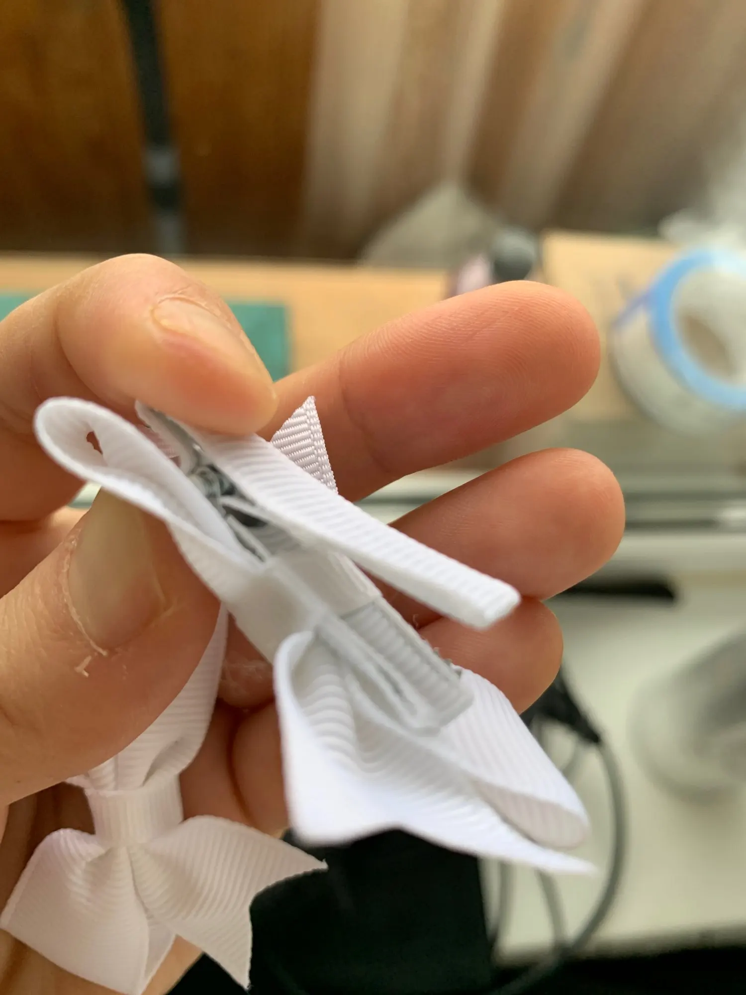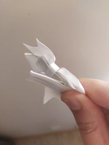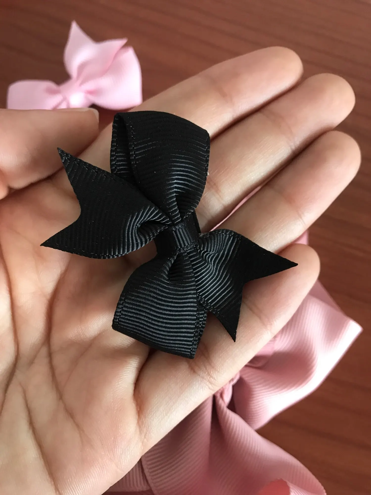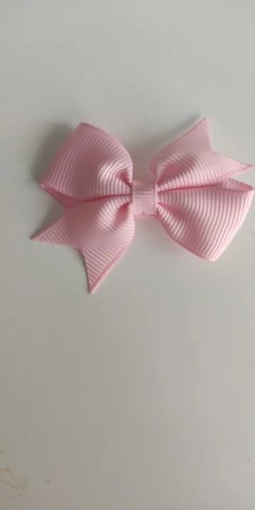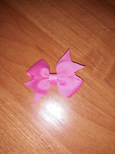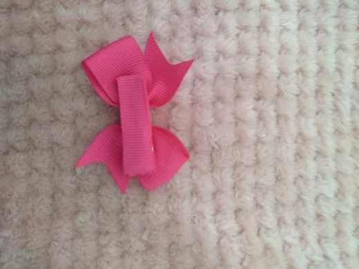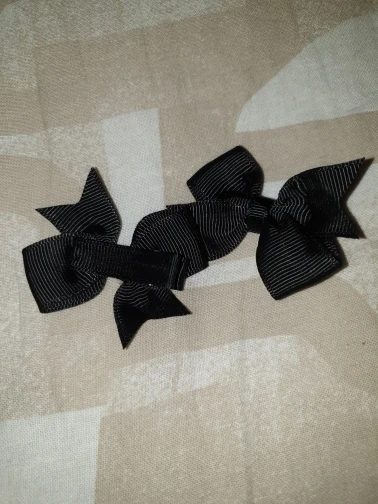 бантик как на фото. сделано аккуратно. все металлические части обклеены лентой, волосы не цепляет. легкая красивая заколка.
