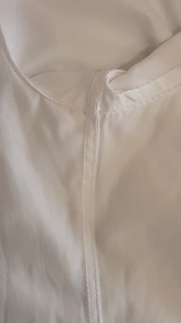 Лазурный насыщенный белый цвет. Пошив качественный. Материал не чистый хлопок, но носится будет хорошо и долго. На большой рост великоват воротник