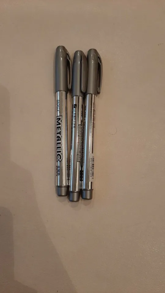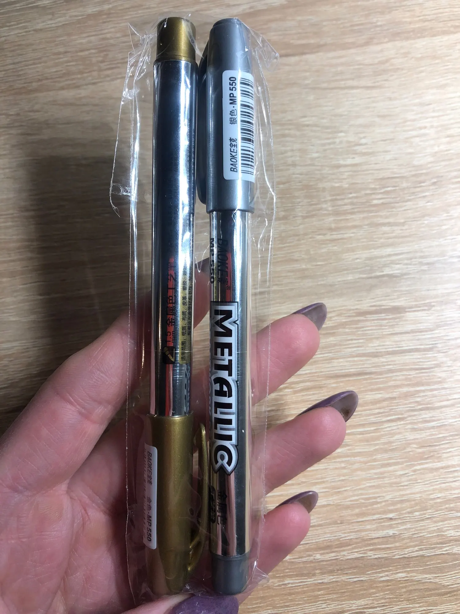 Маркеры пришли в отличном состоянии. Маркеры очень красивые; цвет яркий, плотный с первого слоя. Красиво переливается на свету, при искусственном освещении, как и все металлические цвета, немного темнее и не блестят. Пробовала писать на бумаге разного цвета и разной плотности (фото ниже). На чёрной бумаге смотрится очень красиво, цвет ярче и действительно как металл. На белой бумаге тоже красиво. На бумаге плотностью 80 г/см на обратной стороне бумаги линии в один слой немного просвечиваются, в два слоя - пропечатываются. На бумаге плотностью 135 г/см лучше: один слой не виден (не просвечивается, не пропечатываются), два слоя - немного просвечивает, но никак не портит лист. Маркеры очень надежно закрываются, колпачок тугой, можно не бояться, что они откроются и протекут.