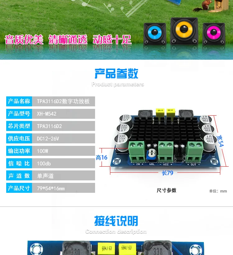 XH-M542 TPA3116 D2 одноканальный высокой мощности цифровой аудио усилитель мощности плата TPA3116D2 мобильный динамик усилитель 24 В