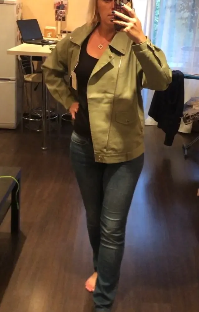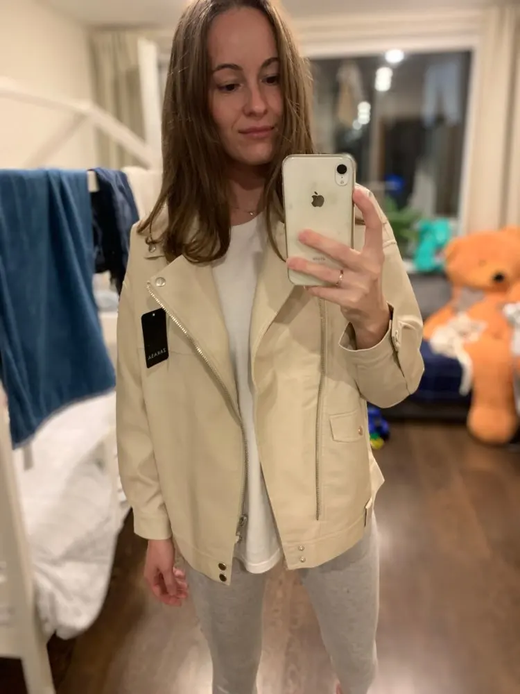 куртка пришла за 3 недели. заказывала м размер на мои параметры ог 93, от 68,об92 и рост 167см.Цвет больше по оттенку приближен к айвори.Куртка по качеству хорошая, есть конечно небольшие минусы по пошиву, но это не так заметно.Куртка очень приятная на ощупь, кожзам качественный,плотный по структуре.Можно носить и теплой и прохладной весной и осенью.Без запаха.длина спины несколько короче чем перед, может это так задумано, но это не критично. Куртка мне прикрывает пол попы, в принципе я так и хотела чтобы длина куртки была ниже пояса, фурнитура хорошая, качественная, большой плюс это глубокие караманы! Рукава не короткие и не длинные. Под неё можно одеть и теплую кофту и худи. в принципе куртка по качеству соответствует цене(я покупала за 2тыс) учитывая что такие куртки у нас в три дорога или по качеству вообще ни о чем. Я заказом довольна. Продавца рекомендую!!!