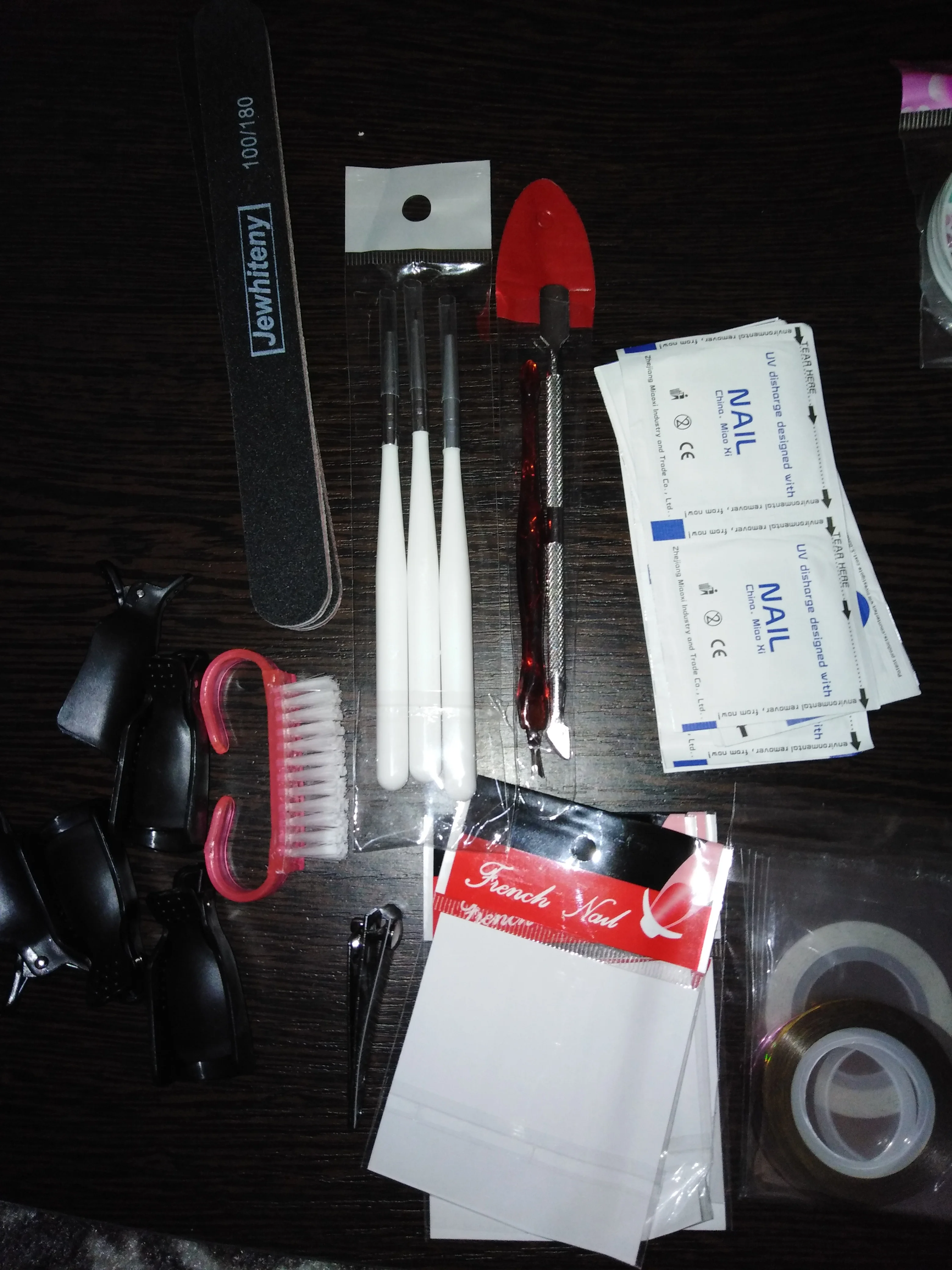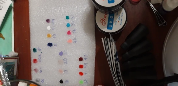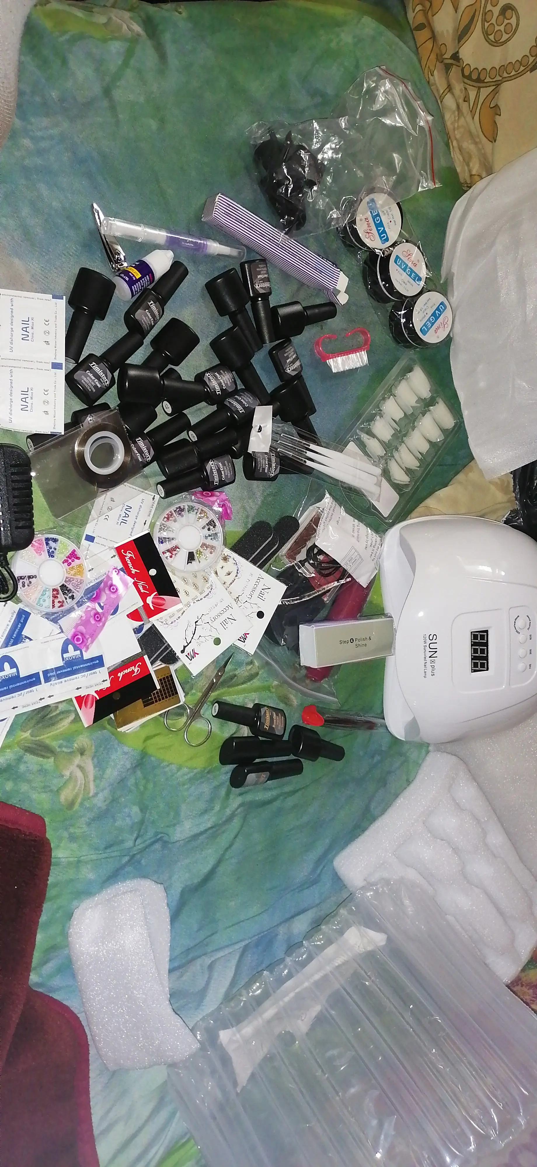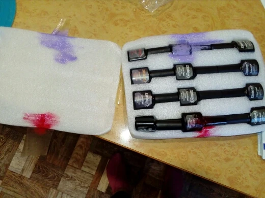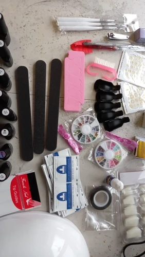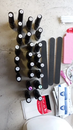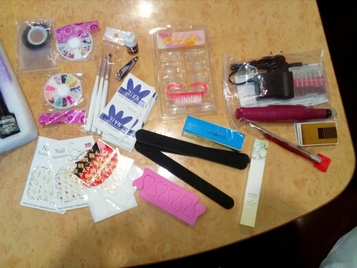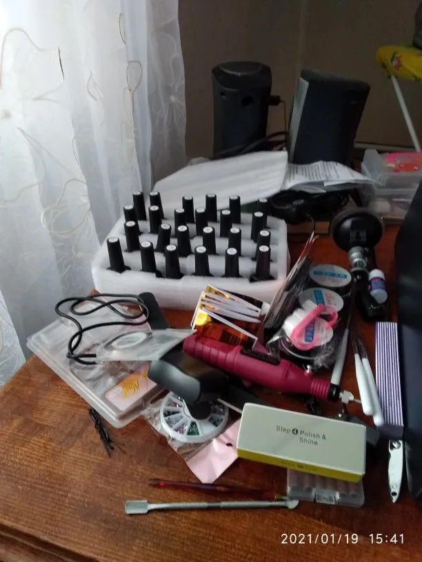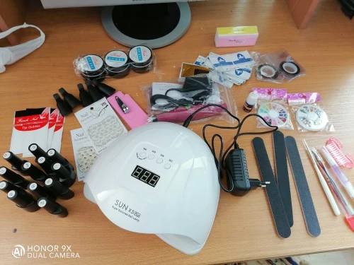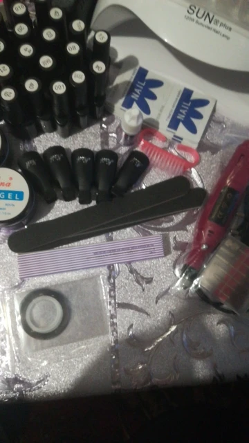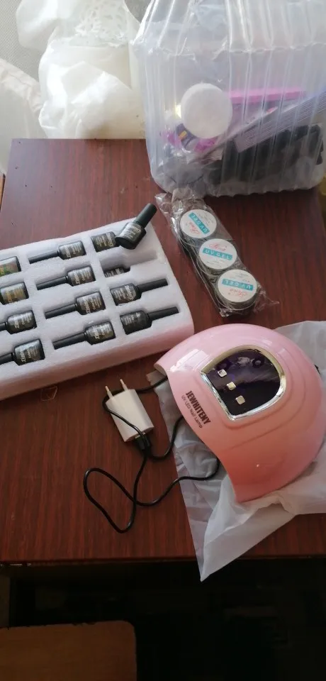 Лаки на половину пусты, а пегмент хороший, все пилочки прмяты, кисточка одна ужасна. Клей почти пуст. А все остальное очень хорошее, база и топ в меру густые. Лампа шик. Автоматически выключается и включается, когда ставишь под неё руку. Аппарат сойдёт для учёбы. Зажимы слабые очень. UV гель полный. Не что не сломано, не протекло. Доставка канечно очень долгая, с Китая. И продавец нормально не отвечал когда ожидать заказ. Ждала почти 3 месяца.