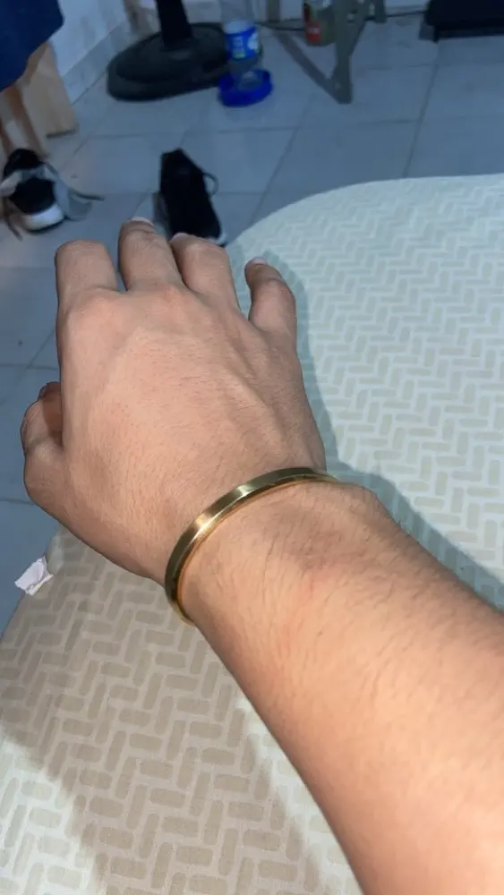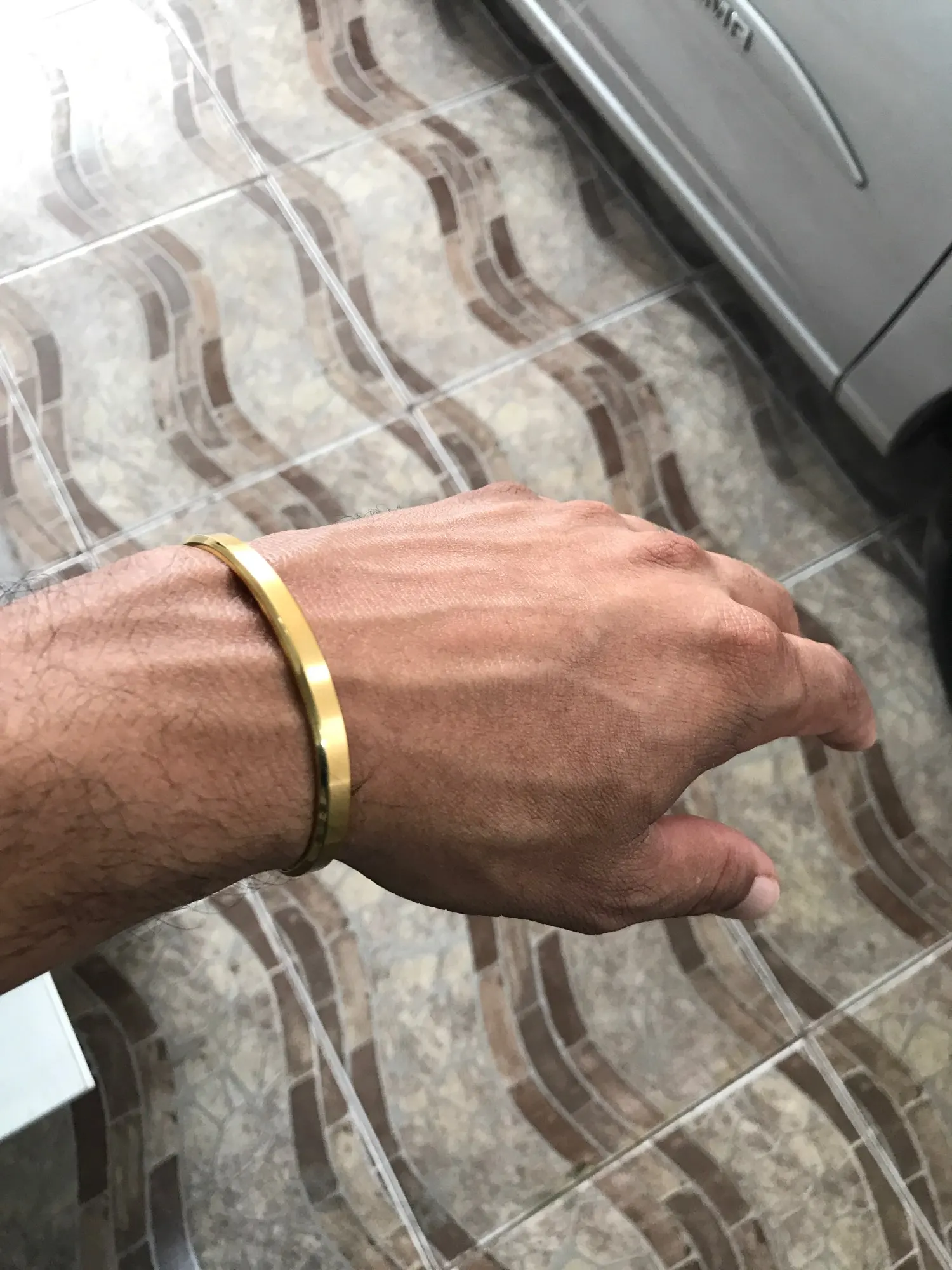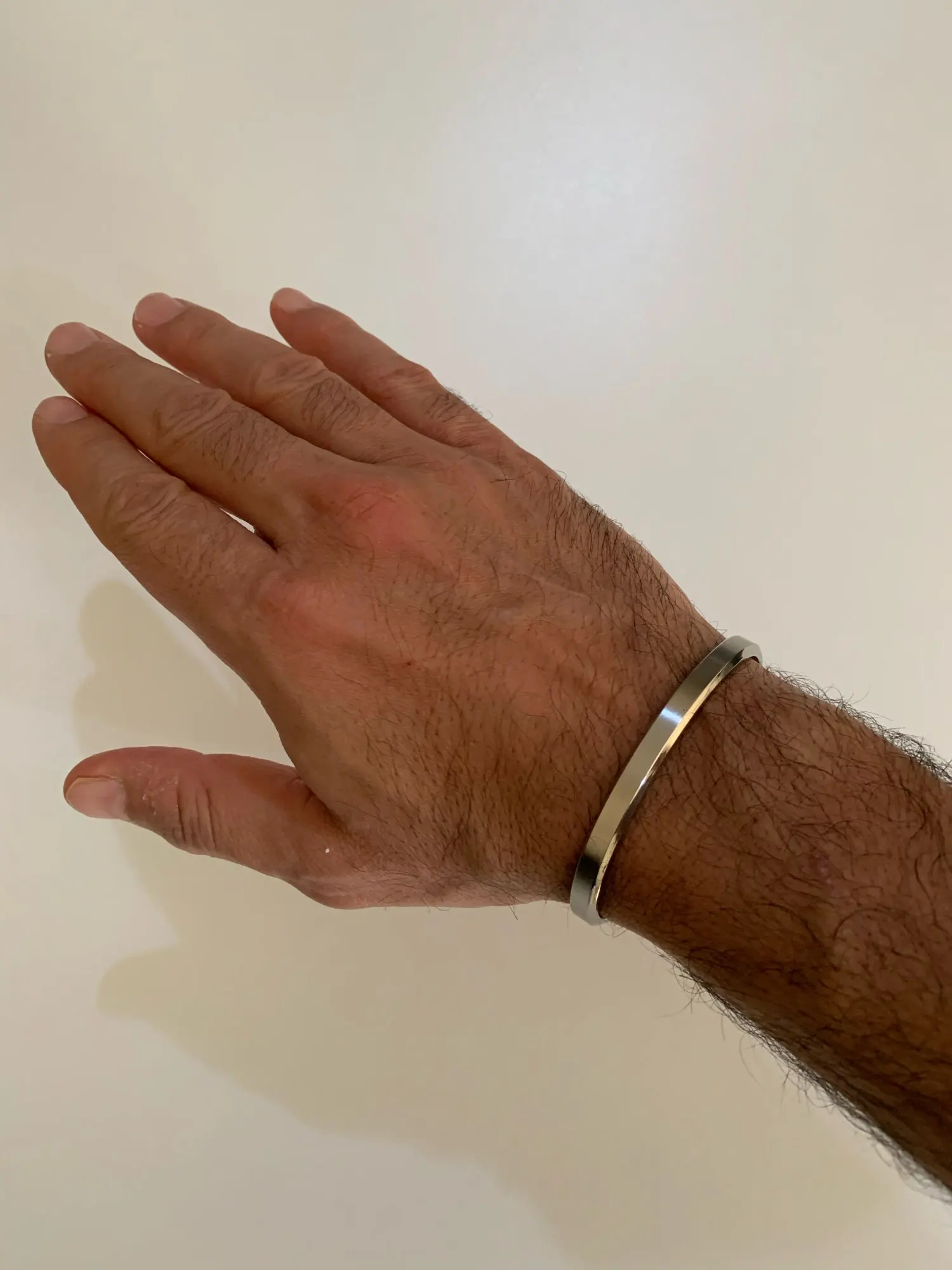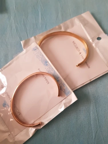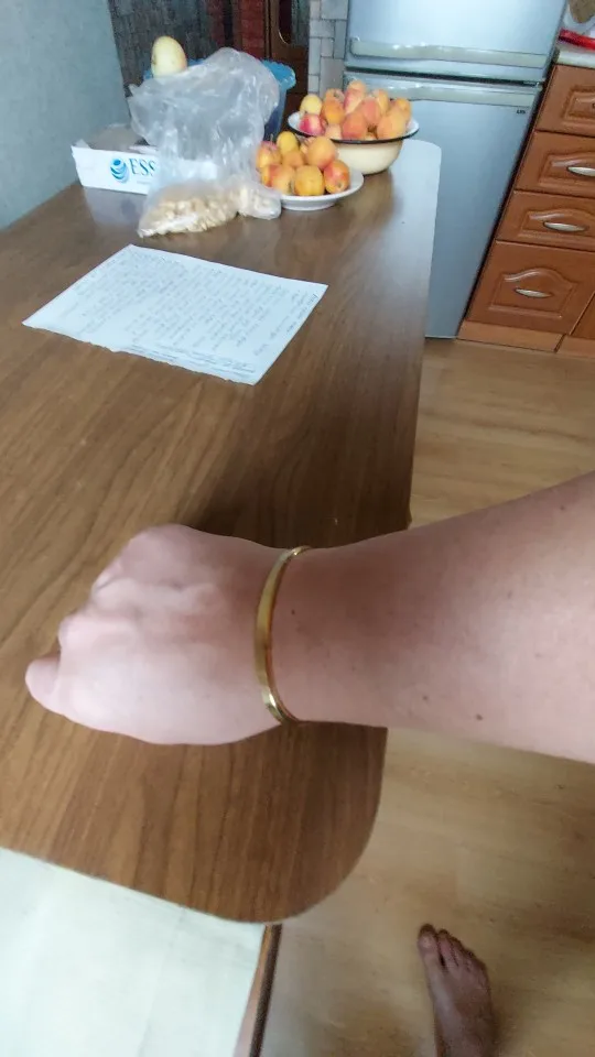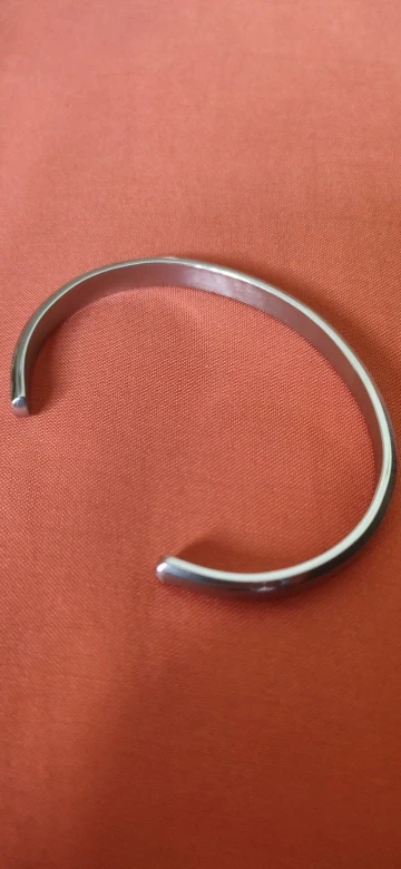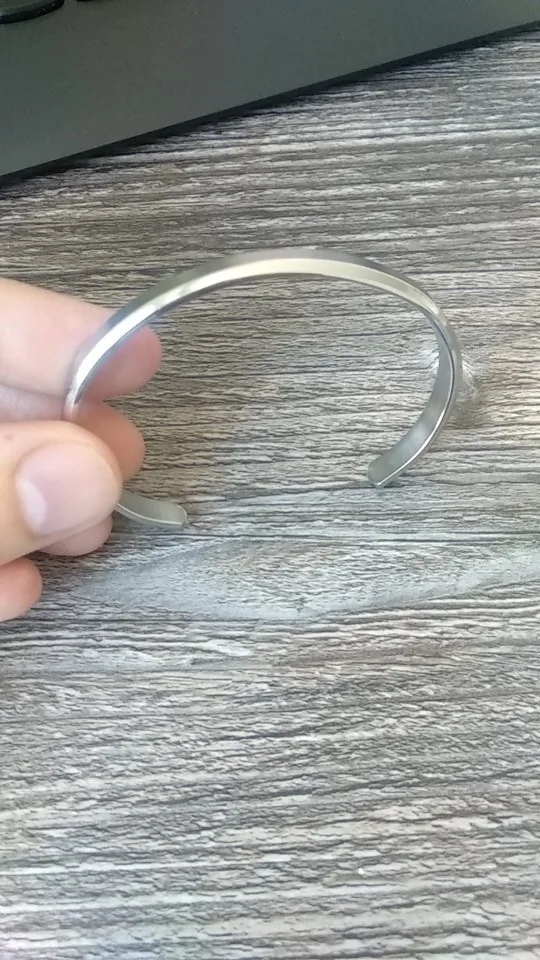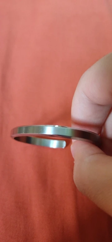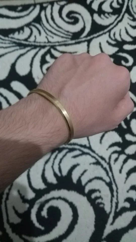 Браслет точно, как на фото. Гладкий и ровный. С моей руки слетает, мужу хорошо сел, ему понравился. Доставка заняла ровно месяц, день в день. Подарок от продавца - резинка для волос. Спасибо!