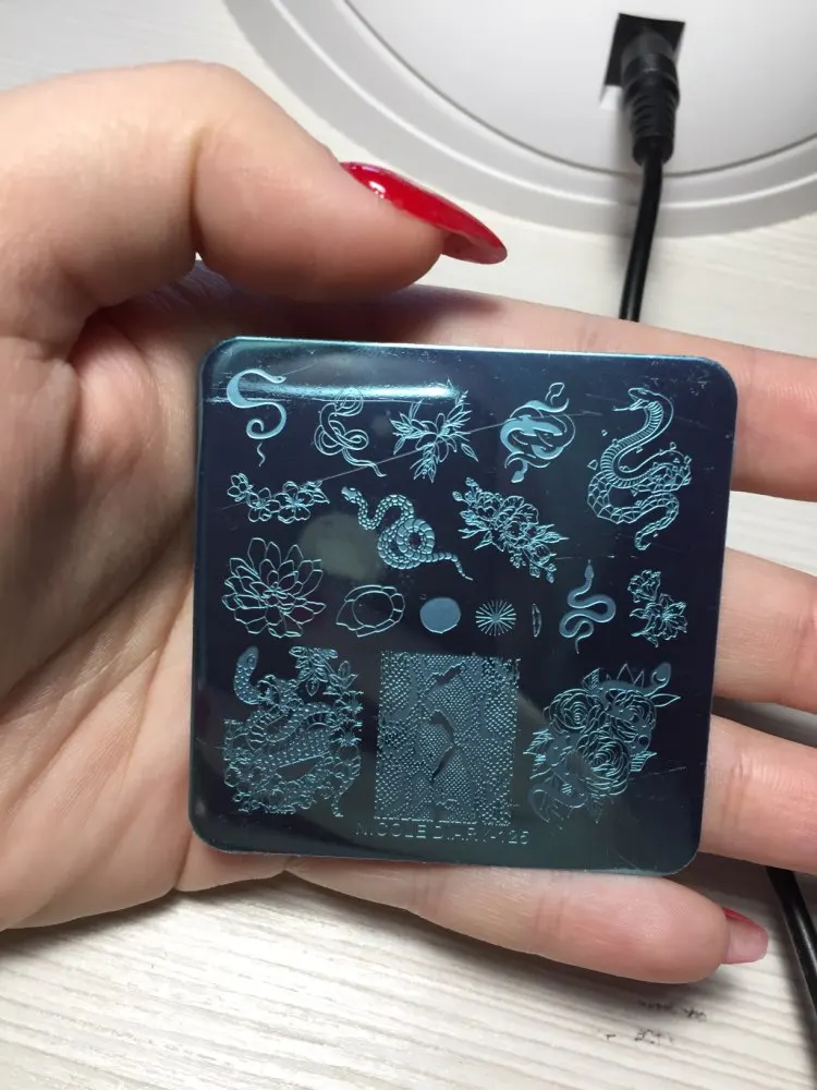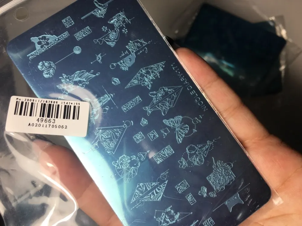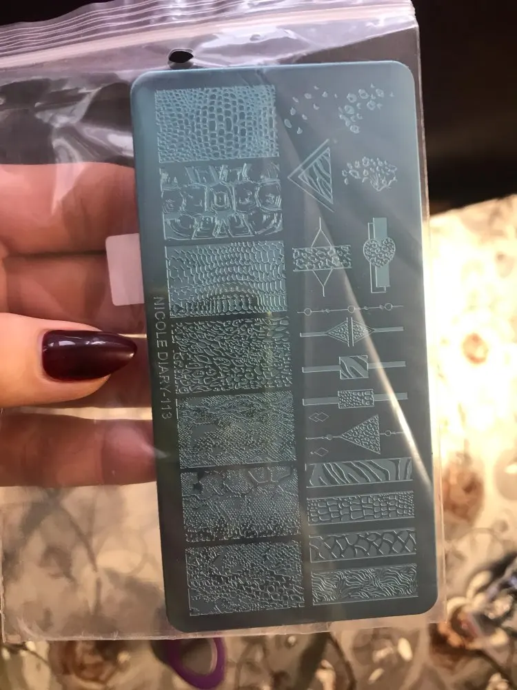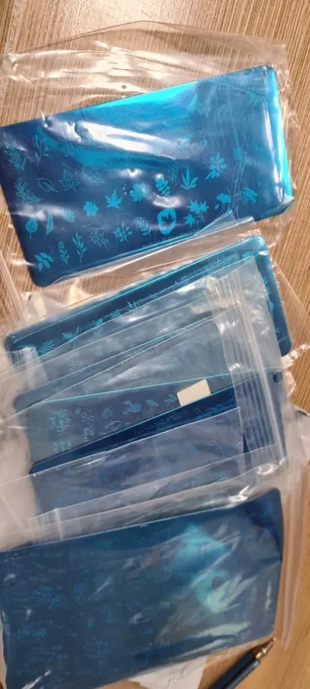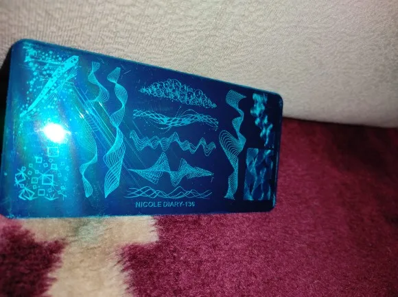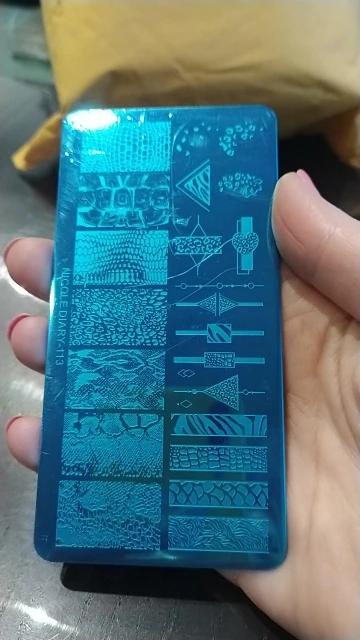 Посылка в Киев доехала за 1,5 месяца. Упакована без жесткой упаковки, просто в пупырчатом пакете. Ровная, без царапин. Размер пластины 12х6 см, без подложки. На вид гравировка хорошая (в работе еще не пробовала). Рисунки маленькие - только на короткие ногти, размер прямоугольных оттисков в нижнем ряду 1,7х1,4 см, остальные соло - еще меньше.