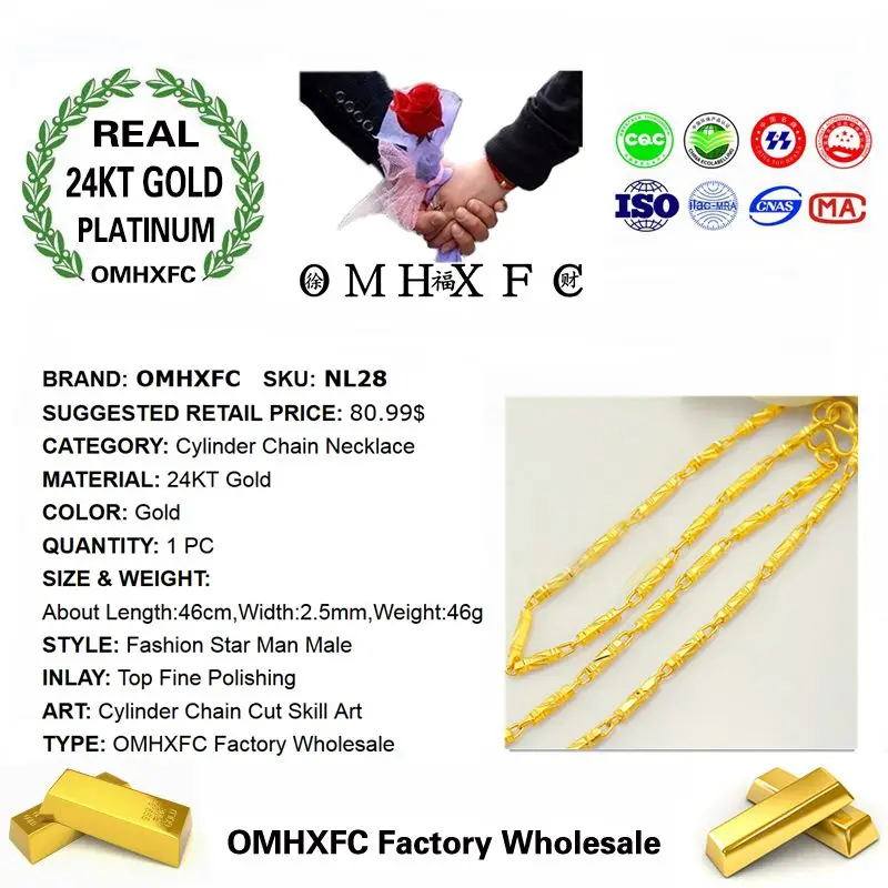 Ожерелье OMHXFC из настоящего золота 24 карата в форме цилиндра длиной 46 см шириной 2,5 мм для мужчин и вечерние, оптовая продажа, Европейская мода, подарок на свадьбу и вечеринку, NL28