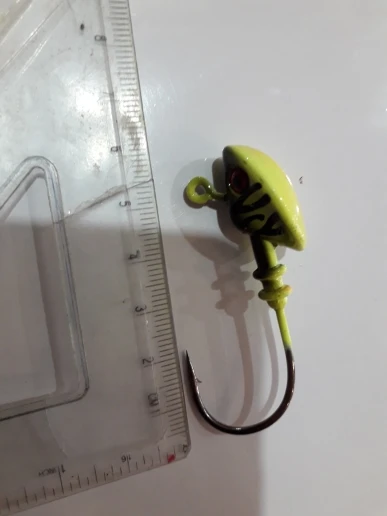 Очень хорошее качество, красивая отделка, отличная окраска веса варьируется максимум 0,1 г, крючок усилен, может зацепить большую рыбу, которая не будет открываться, думаю, что это должно быть 3/0 в 10 граммов, размер около 3,9 см полный размер и 1,5 см отверстие.