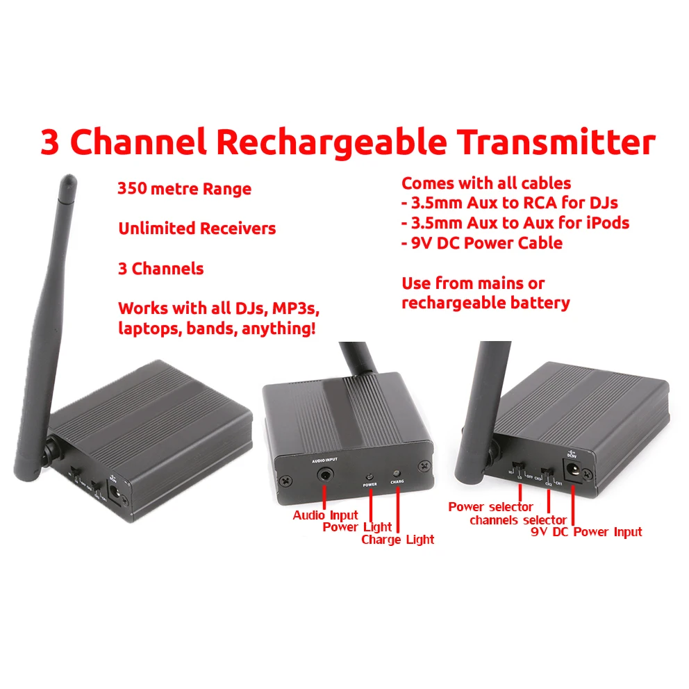 3.Внутренняя батарея встроена в передатчик для удаленного использования. Переключатель уровня мощности передачи (Высокий/низкий). Доступное стереоАудиовход на передатчике.