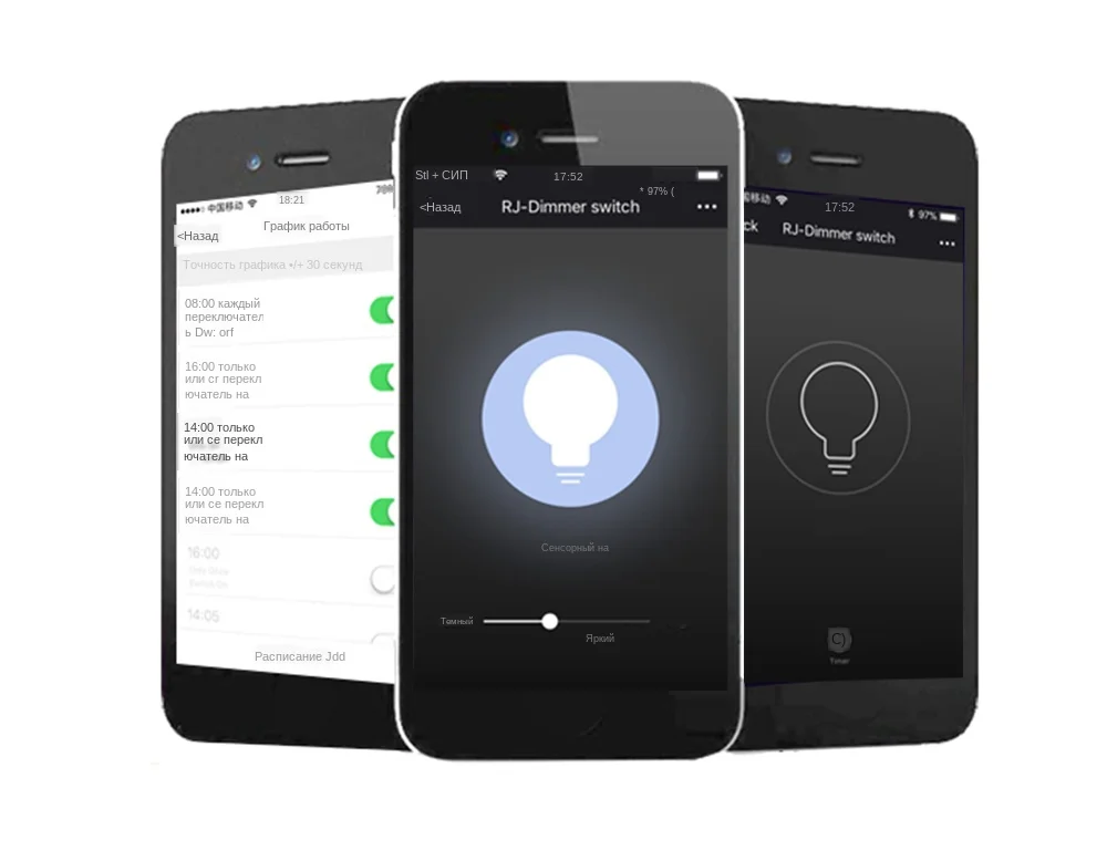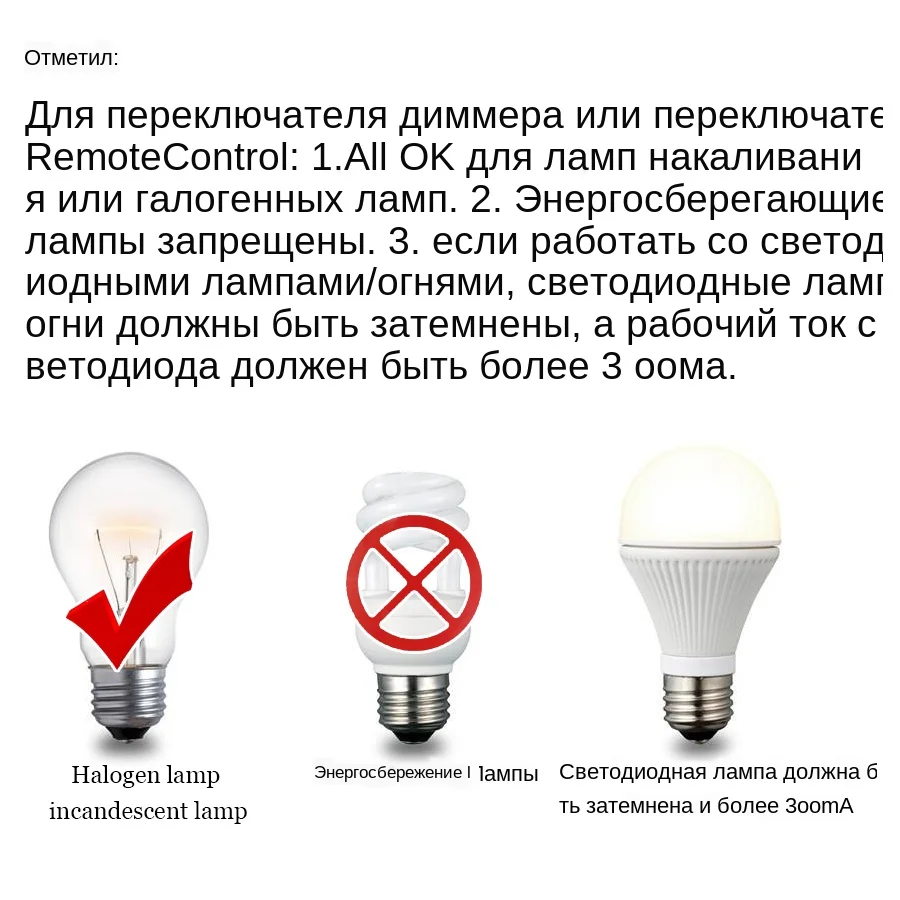 Не все виды ламп совместимы с диммером, пожалуйста, ознакомьтесь с информацией ниже и проверьте наличие лампы для диммера перед заказом диммера. Яркость обычных светодиодных ламп нельзя уменьшить с помощью диммера, но их можно выключать и включать им. Обычная светодиодная лампа не подходит для нашего диммера. Режим диммера позволяет уменьшить яркость в трех вариантах: на 20%, 50%, 90% от исходного освещения. Это должна быть диммируемая cветодиодная лампа. Все энергосберегающие лампы не подходят для диммеров. Люминесцентные лампы не подходят для выключателей с затемнением. Общая мощность осветительных приборов или приспособлений, используемых одновременно, не может превышать 150 Вт.