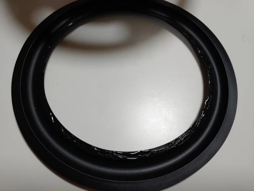 Подвес прорезиненный. Отличный подвес. Менял на динамике Sveen 4ом, 10Вт. Родной подвес был полиуретановый, помягче. Но при замене катушки в динамике подвес родной порвался. По размерам подошёл просто отлично. Рекомендую для ремонта динамиков.