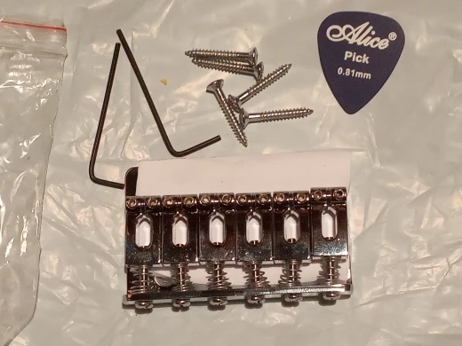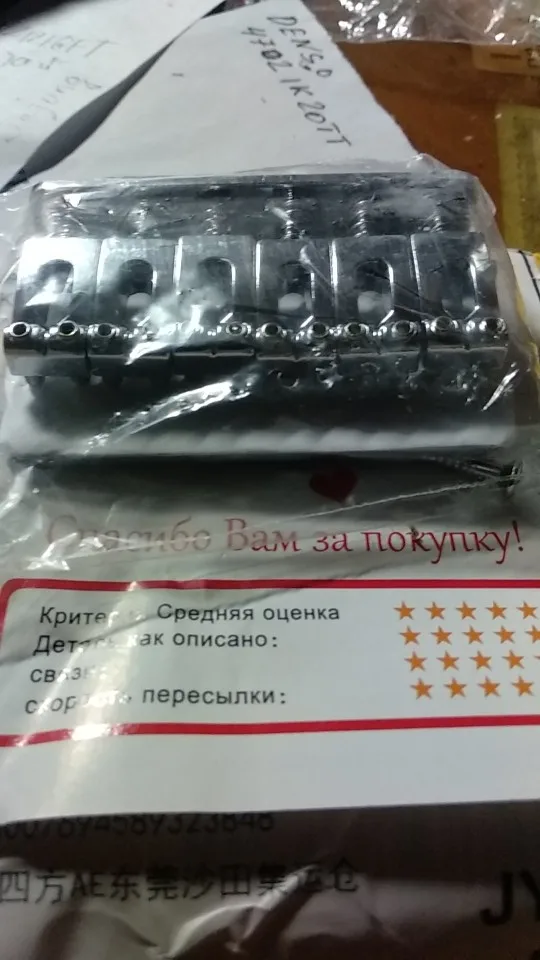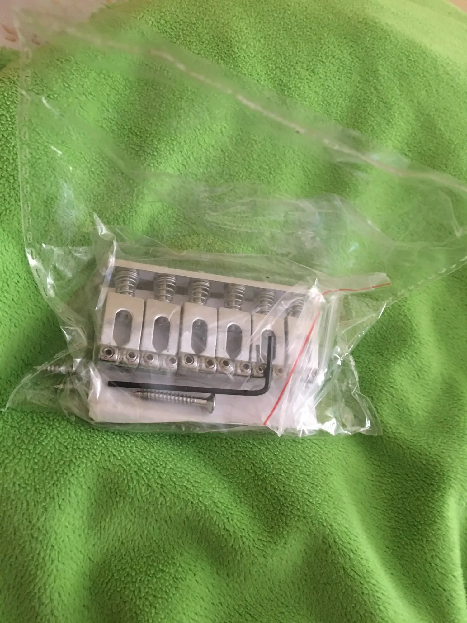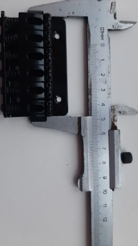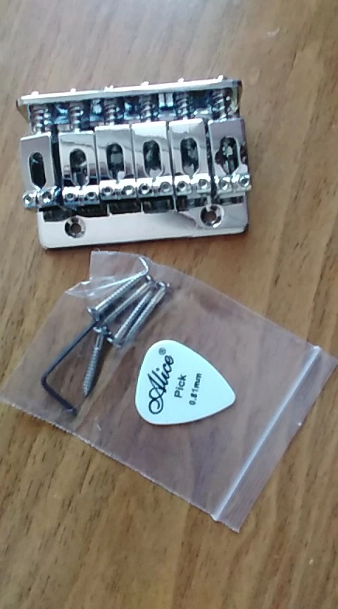 Оплатил 4 марта, 19-го уже был на местной почте. Целый и не повреждённый. Некоторые размеры и конструкционные особенности не указаны. Поэтому уточняю. В МОЁМ варианте поставки: 1.ширина 6 сёдел ровна 63мм. среднее расстояние между струнами будет 10,5мм. Среднее расстояние важно для "центровки" пикапов. Сёдла цинк алой никелированные достаточно хорошо. 2. Центр регулирующего мензуру винта на мосту расположен ПРАВИЛЬНО - ось винта не в "горизонте", а под достаточным углом к подошве. Пружины правильные - конические, не закусываются при регулировке мензуры (не надо применять шайбы). Длина регулировки мензуры с учётом пружины - 8,5мм. Винты М3, сталь. Подошва сталь. 3. Длина регулирующих высоту струн винтов 10мм. Сталь. Пределы регулировки высоты порядка 4,5мм. 4. Подошва 2мм. Минимальная толщина подошвы с седлом с учётом выемки под струну в седле 7,2мм.