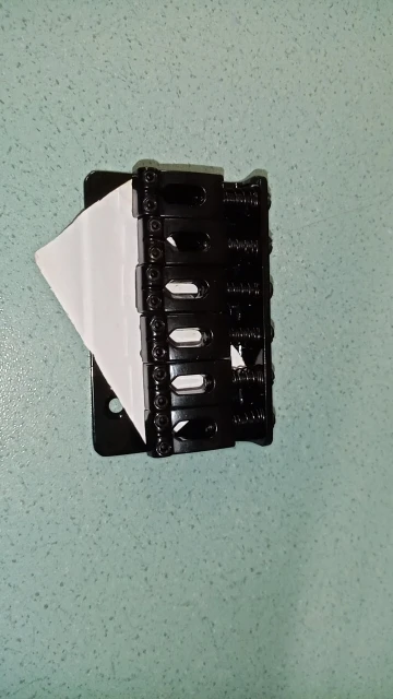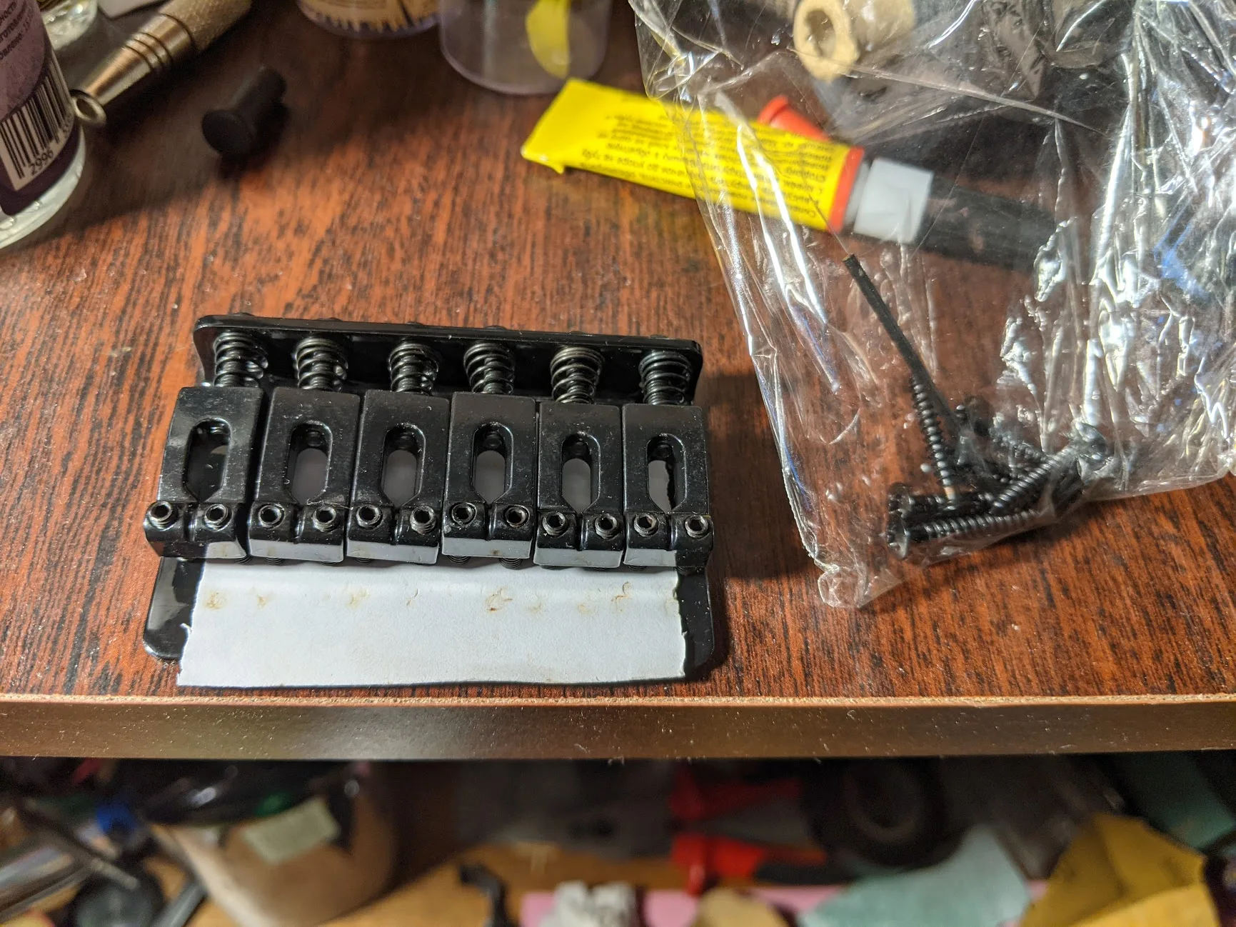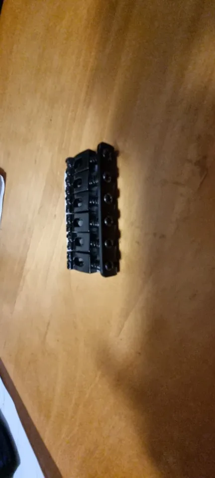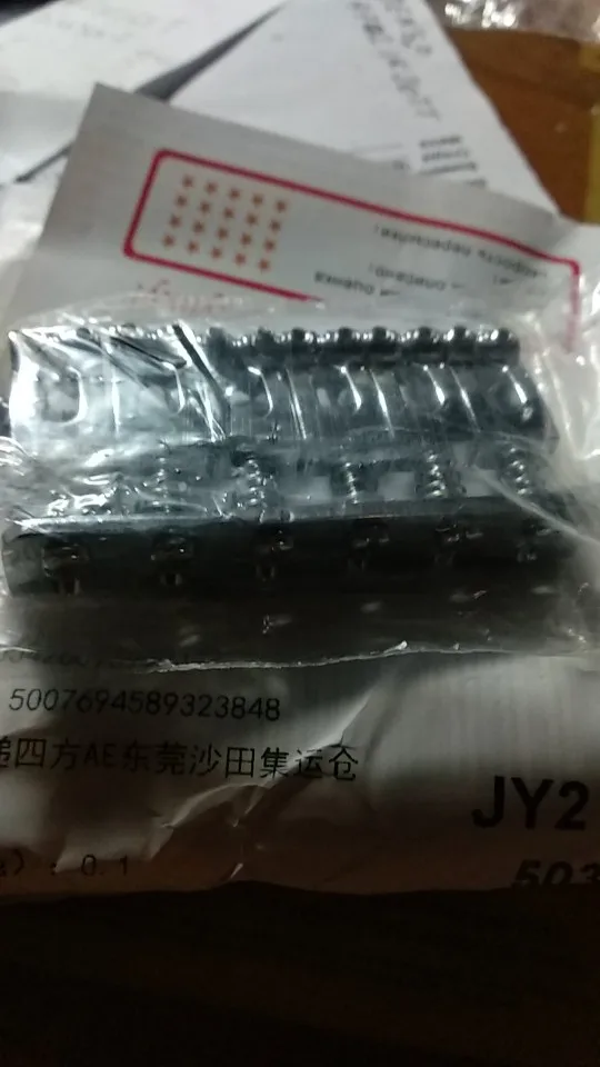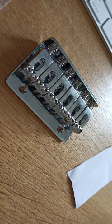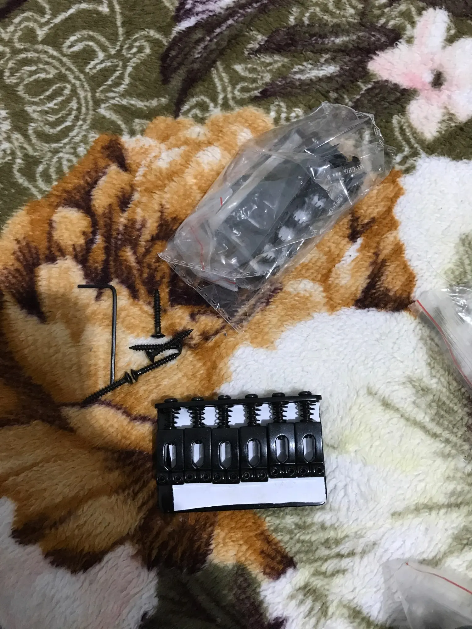 Оплатил 4 марта, 19-го уже был на местной почте. Целый и не повреждённый. Некоторые размеры и конструкционные особенности не указаны. Поэтому уточняю. В МОЁМ варианте поставки: 1.ширина 6 сёдел ровна 63мм. среднее расстояние между струнами будет 10,5мм. Среднее расстояние важно для "центровки" пикапов. Сёдла цинк алой никелированные достаточно хорошо. 2. Центр регулирующего мензуру винта на мосту расположен ПРАВИЛЬНО - ось винта не в "горизонте", а под достаточным углом к подошве. Пружины правильные - конические, не закусываются при регулировке мензуры (не надо применять шайбы). Длина регулировки мензуры с учётом пружины - 8,5мм. Винты М3, сталь. Подошва сталь. 3. Длина регулирующих высоту струн винтов 10мм. Сталь. Пределы регулировки высоты порядка 4,5мм. 4. Подошва 2мм. Минимальная толщина подошвы с седлом с учётом выемки под струну в седле 7,2мм.