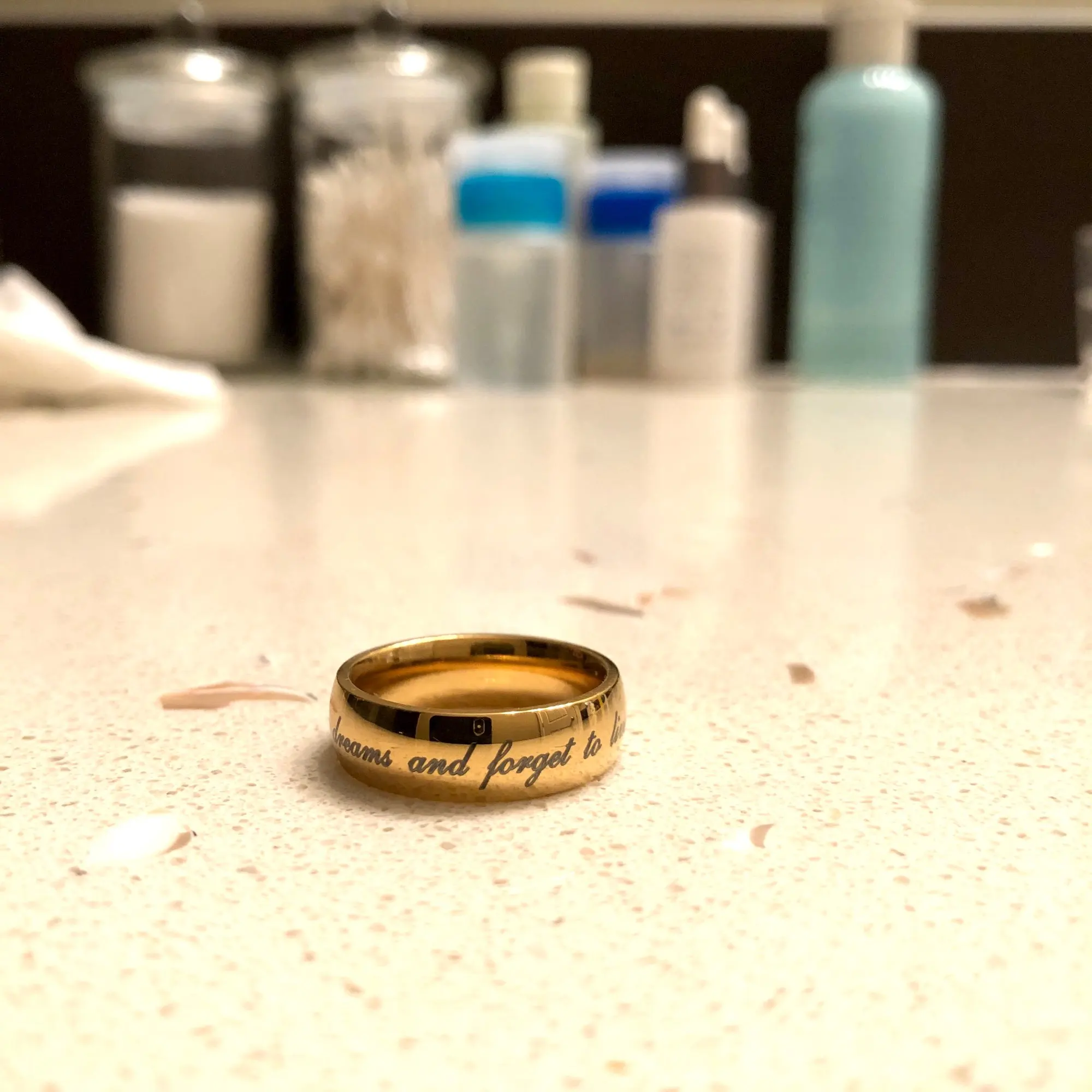 Красивое кольцо и шрифт... к сожалению, это гравировка с даты до неправильного места (снаружи вместо внутри)... падает немного больше от... Быстрая доставка