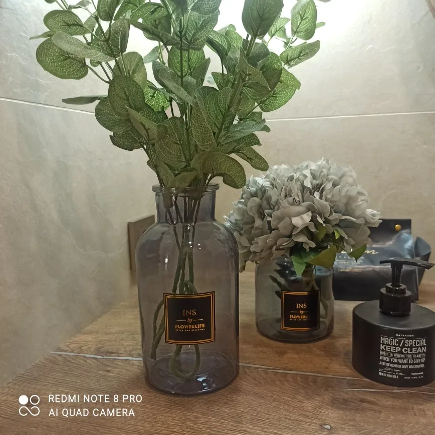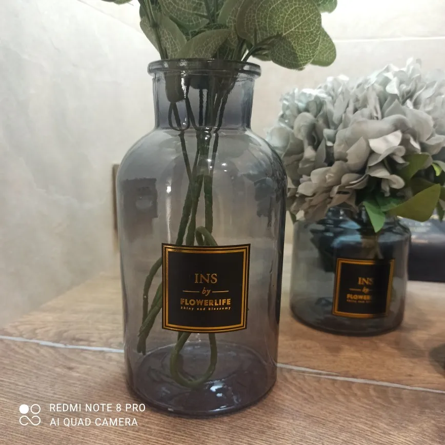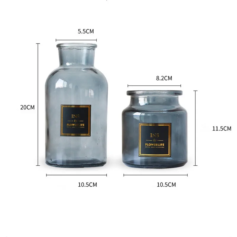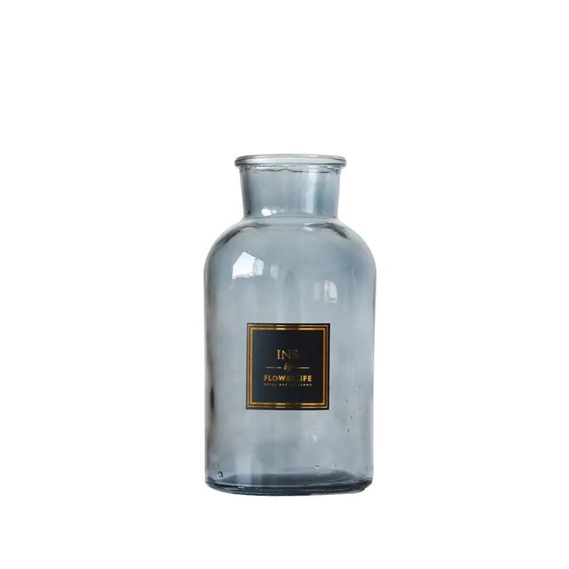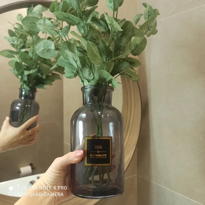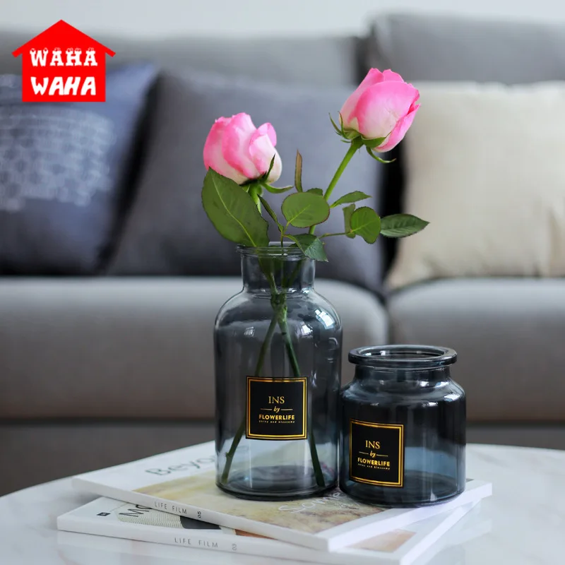 Ваза из серого стекла для спальни, прозрачная стеклянная ваза, настольные Предметы интерьера, миниатюрная Золотая наклейка