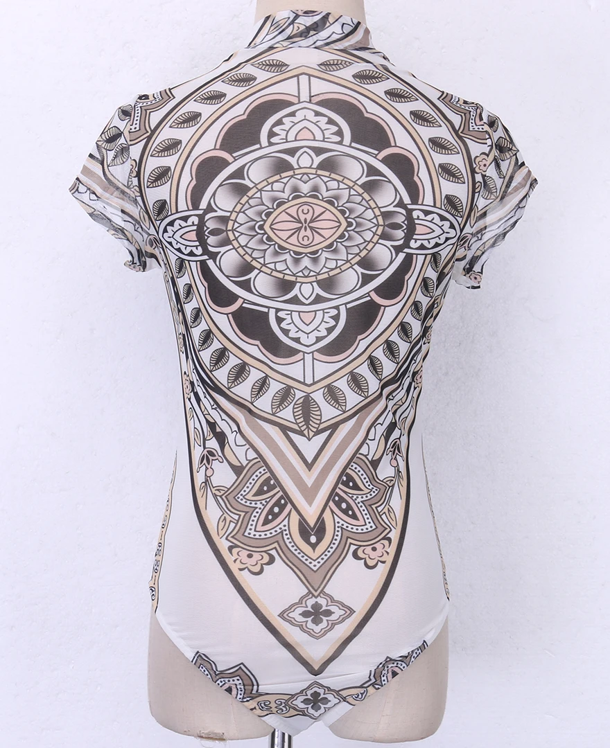 Женское готическое облегающее боди, эластичное прозрачное Сетчатое прозрачное боди с коротким рукавом и принтом в этническом стиле