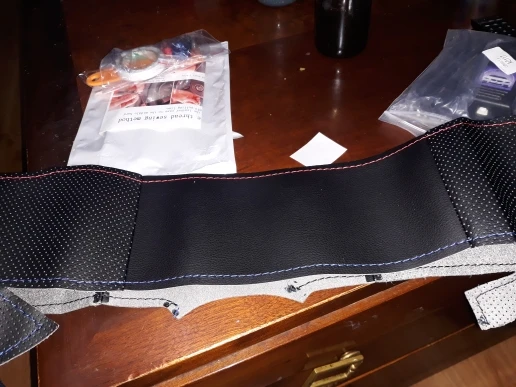 Материал хороший не воняет, есть инструкция по установке и два комплекта ниток и иголок что вполне достаточно. Если у вас нету выпуклости под большие пальцы надо заранее подложить что нибудь, было бы хорошо если бы производитель заранее положил что нибудь под выпуклость, есть фото до и после установки. В целом товаром доволен.