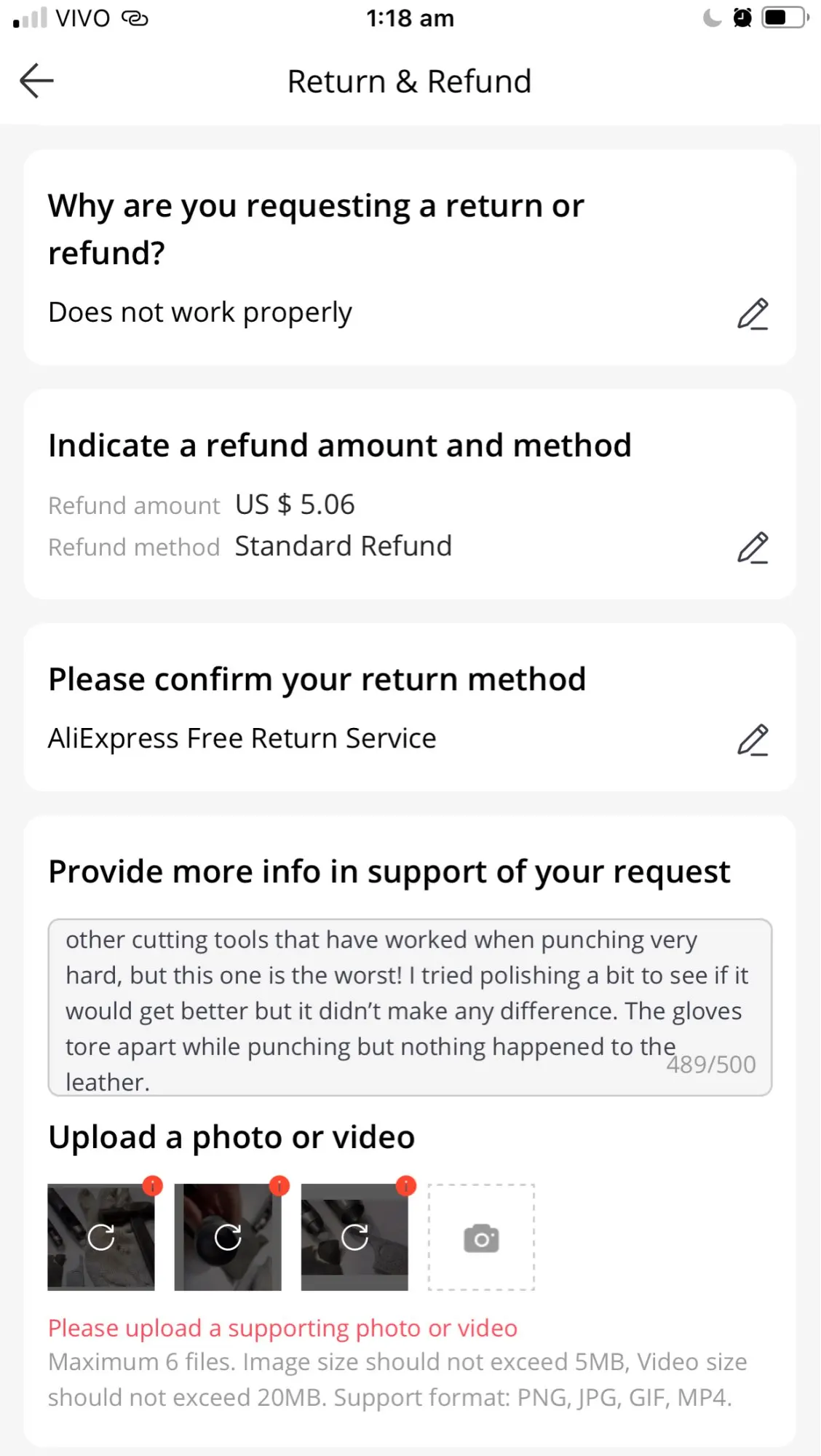 Инструмент наивысшего качества! Я примерил инструмент на многих полосках кожи, и он не работает ни на одном из них, даже на тонкой коже или твердой бумаге. Он даже не начинает резать его, только делает отметку после того, как пробивал действительно жесткий с тяжелым молотком. Я купил другие режущие инструменты, которые работали при штамповке очень сильно, но это самое худшее! Я попробовал немного полировать, чтобы убедиться, что он станет лучше, но это не изменило. Перчатки порвались во время пробивки, но с кожей ничего не произошло. Я также попробовал открыть спор, но не разрешал отправлять, потому что не мог загрузить изображение, даже маленький с 56кб, он всегда приходит с ошибкой. Смотрите скриншоты. Я хочу вернуть его и вернуть деньги.