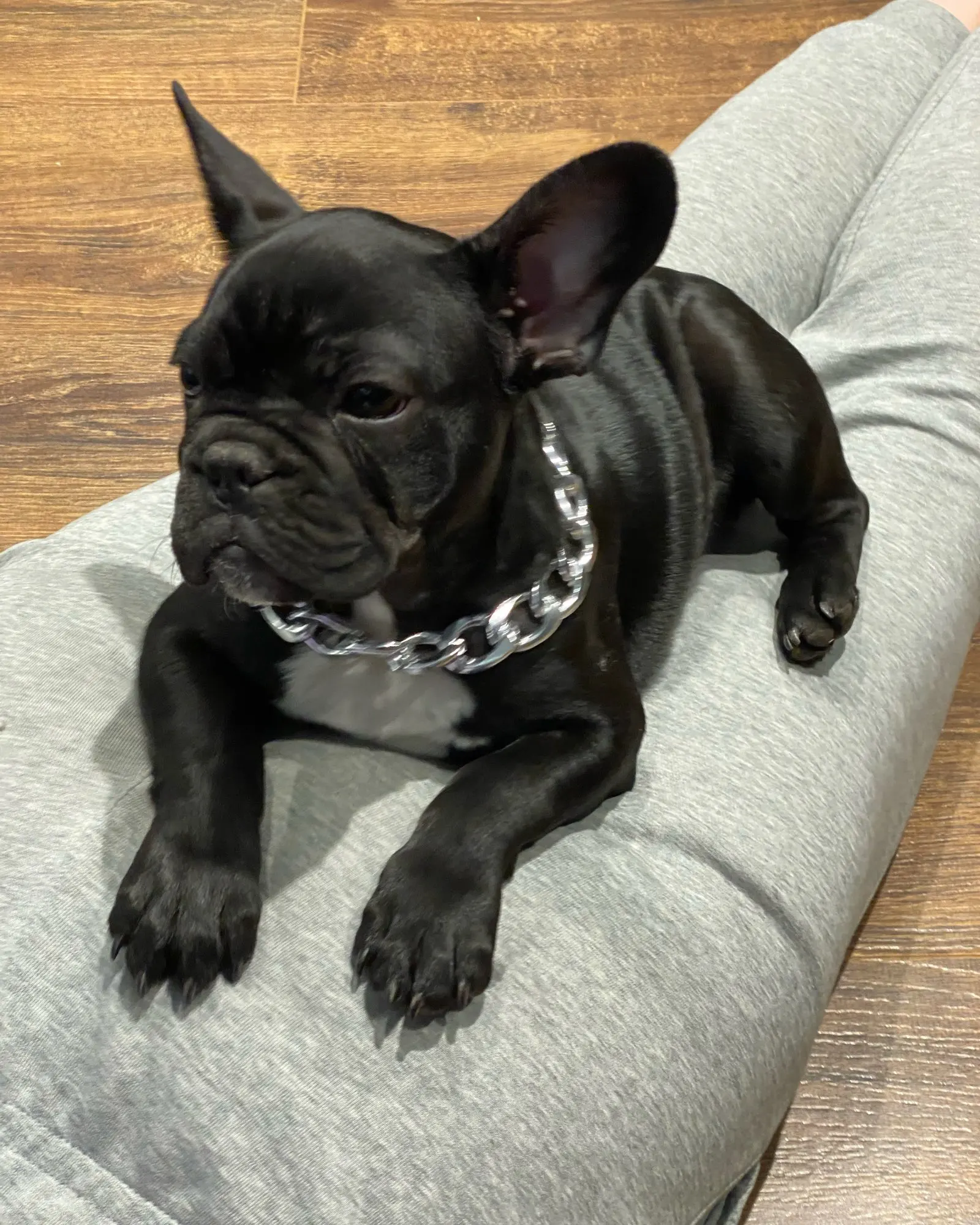 На шее моего француза еле застегнулась. Нужна минимум 40 см