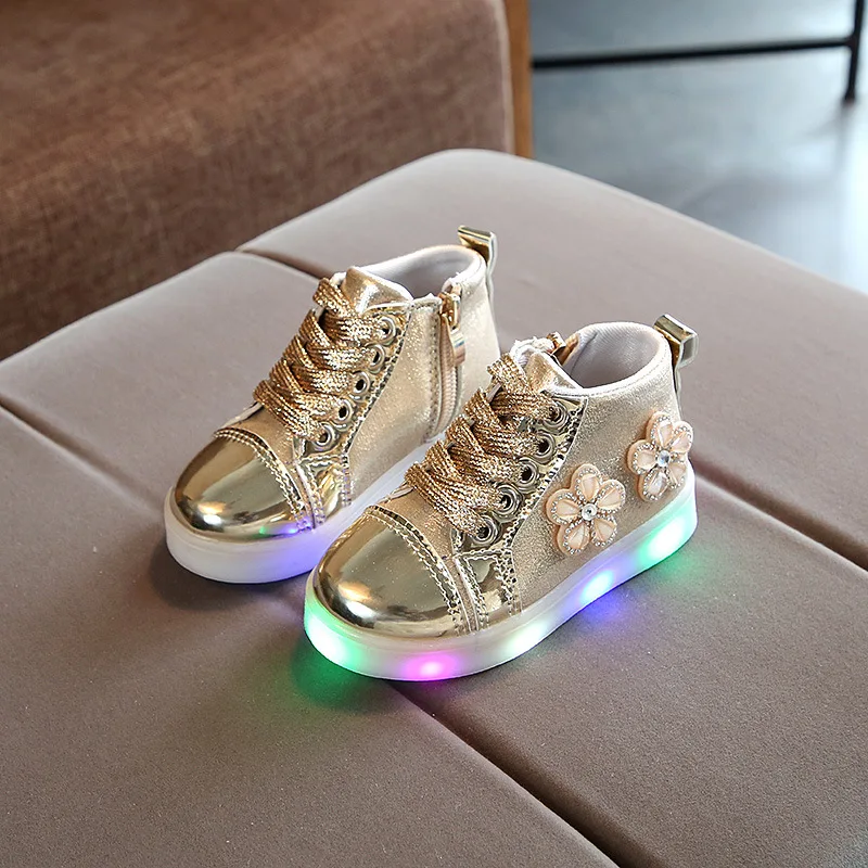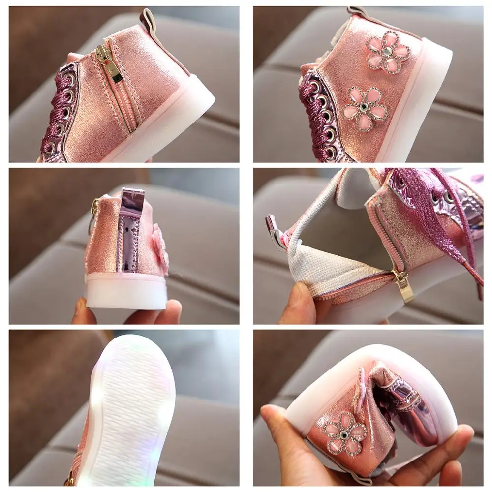 Светящиеся кроссовки для девочек, европейские размеры 21-30, розовые цветочные туфли с блестящей подошвой, обувь с светильник кой для маленьких девочек, обувь со светодиодами для тенниса