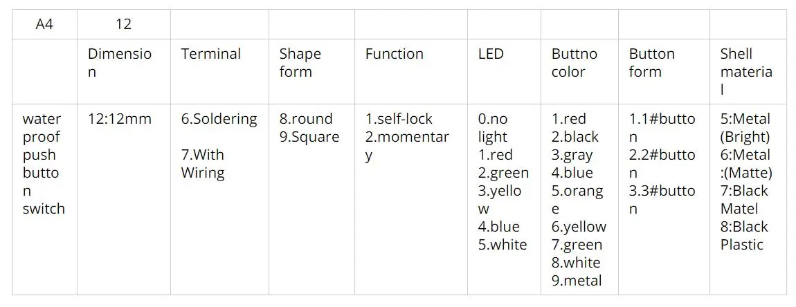 Серия A4126 водонепроницаемый кнопочный переключатель, степень защиты IP67, размер установки 12 мм. Согласно материалу, он имеет металлический кнопочный переключатель и пластиковый кнопочный переключатель. Все переключатели имеют самоблокирующийся и мгновенный два разных вида. При оснащении светодиодный светильник, цвет может быть настроен на основе запроса клиента. Он широко используется в косметическом оборудовании, маленькой яхте, лампах, медицинском оборудовании, интеллектуальном сетевом оборудовании военной связи и других инструментах.