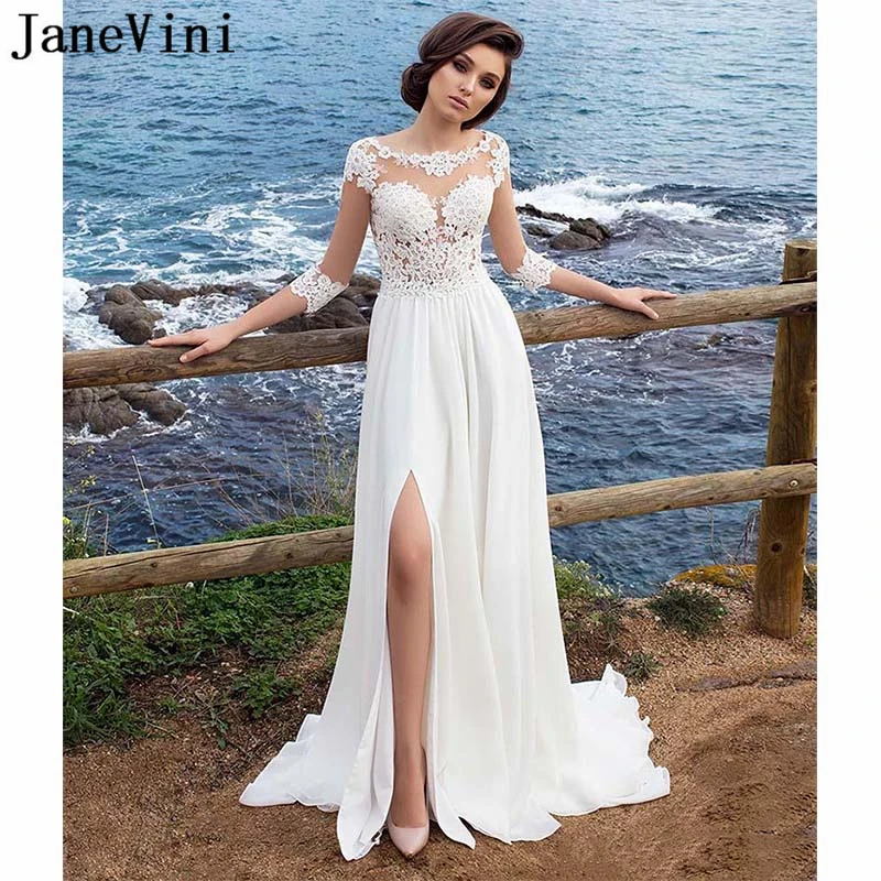 JaneVini сексуальное пляжное длинное свадебное платье Принцесса Круглый вырез Иллюзия Аппликации шифон размера плюс Свадебные платья Vestido De Noiva