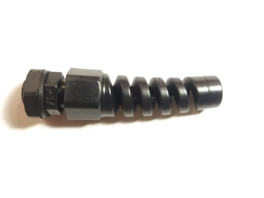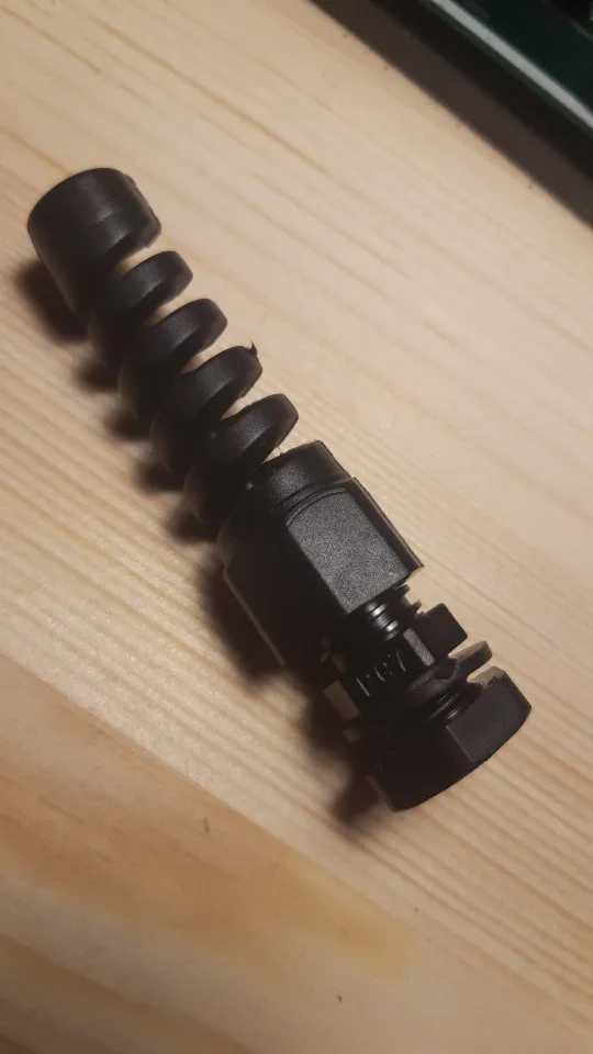 Хороший кабельный ввод: резинки на месте, изолируют как положено; спиралевидный хвост гнётся на 90 градусов не ломаясь (при температуре 25°C). Good quality connector: rubber sealing rings are in place, making a good isolation; helical tail feels strong, doesn't break upon > 90 degree bending (tested at 25°C).