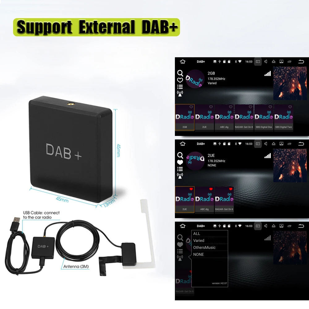 Что такое DAB +?DAB является вещанием третьего поколения после традиционного аналогового вещания AM/FM цифрового аудио вещания. DAB +-это усовершенствованная версия оригинальной технологии DAB. Он также может быть совместим с DAB. Новый радиостандарт DAB: цифровое аудио-вещание позволяет вам многоуровневую музыку с вашими местными известными и также новыми каналами. CD качество звука и отсутствие шума в отличной передаче делают DAB Radio особенным опытом в транспортном средстве. DAB + (цифровое аудио-вещание) постепенно заменил традиционную аналоговую трансляцию AM/FM. Постоянное увеличение каналов и расширение площади станции в скором времени делают DAB доступным для большинства стран Европы. Особенности:* Если ваш android 5,1 и выше автомобильный мультимедиа предварительно установлен DAB + App, просто купите этот USB powered DAB + Box, чтобы получить цифровое радио.* Он подходит для мультимедийных устройств Erisin android и большинства других устройств Android 5,1 и выше на рынке.* Включенная антенна усовершенствована с усиленной функцией, высокой чувствительностью, Используйте порт MCX для подключения.* Подключи и работай, USB порт питания для DAB + коробка и соединительная антенна, не нужен дополнительный кабель питания.* Тонкий дизайн, с 1 метровым usb-адаптером, кабелем питания и 3 метровым антенным кабелем, достаточно долго для установки.
